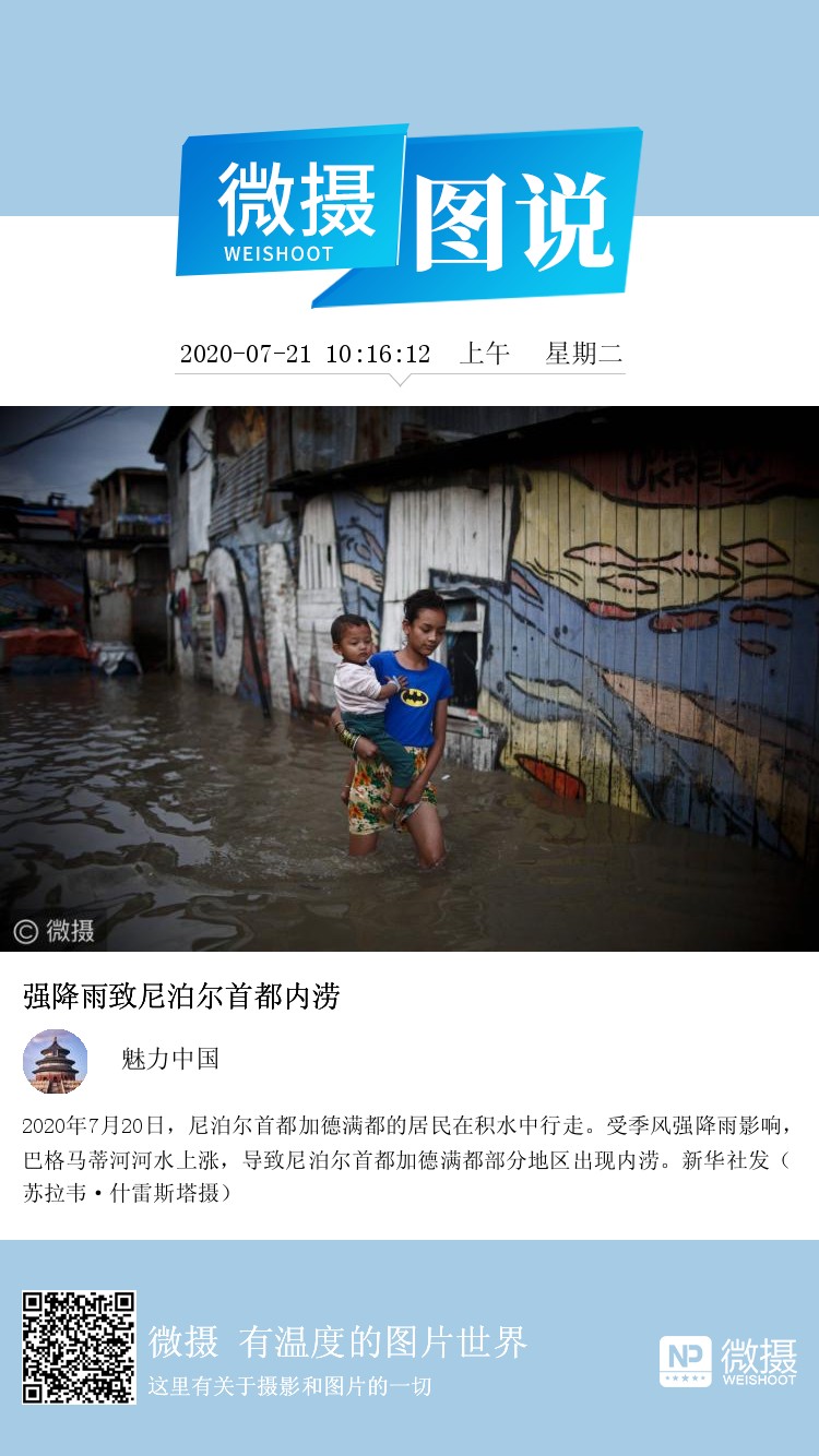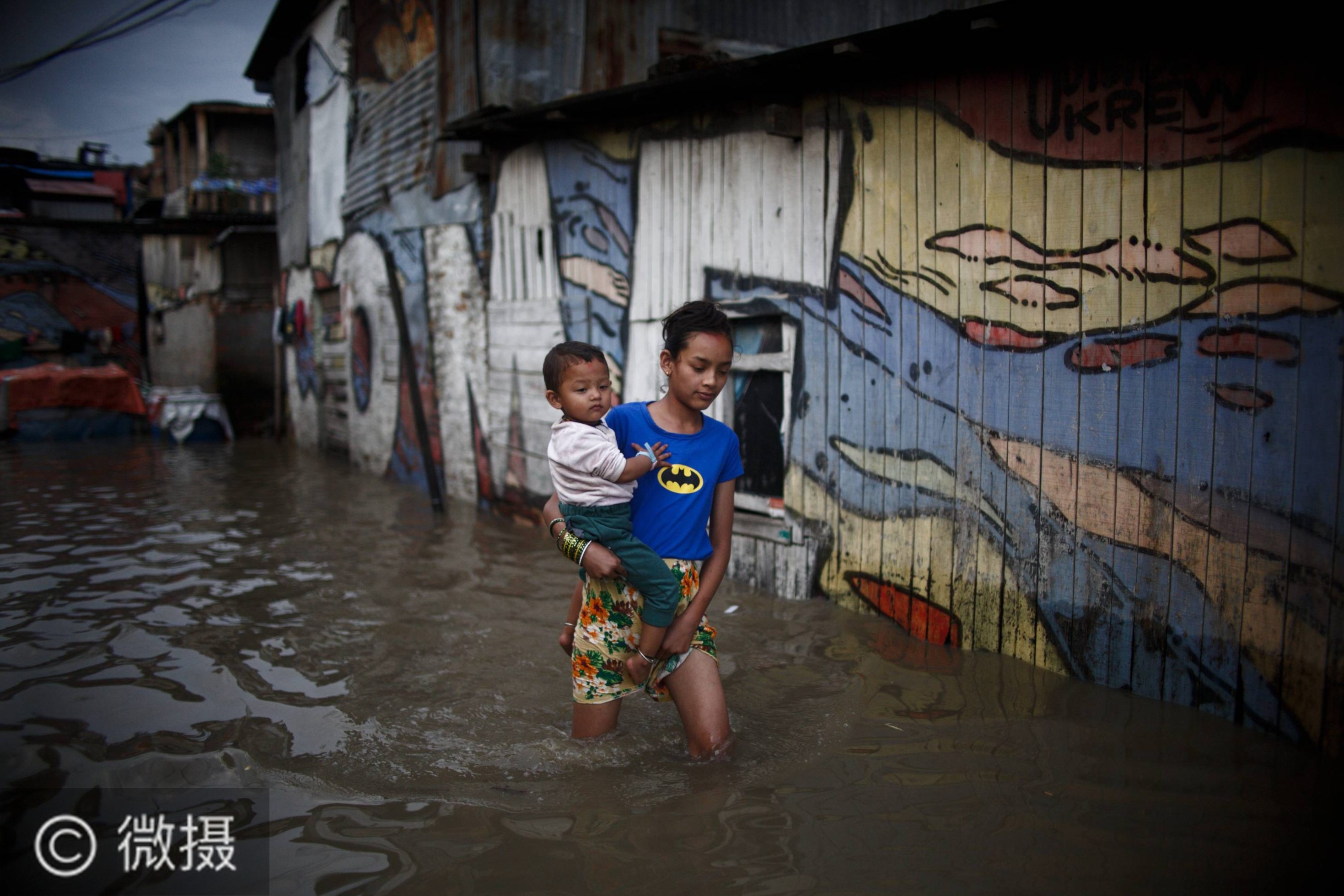2020年7月20日,尼泊尔首都加德满都的居民在积水中行走。受季风强降雨影响,巴格马蒂河河水上涨,导致尼泊尔首都加德满都部分地区出现内涝。新华社发(苏拉韦·什雷斯塔摄)