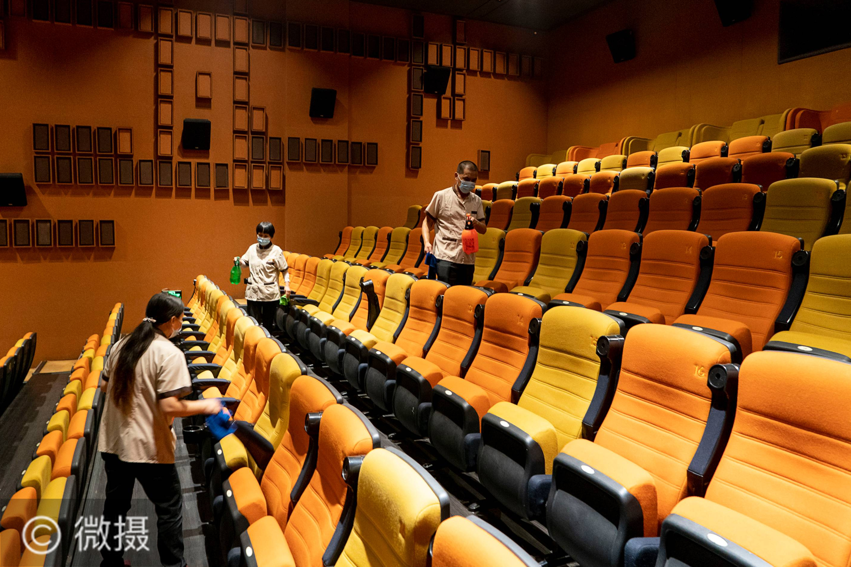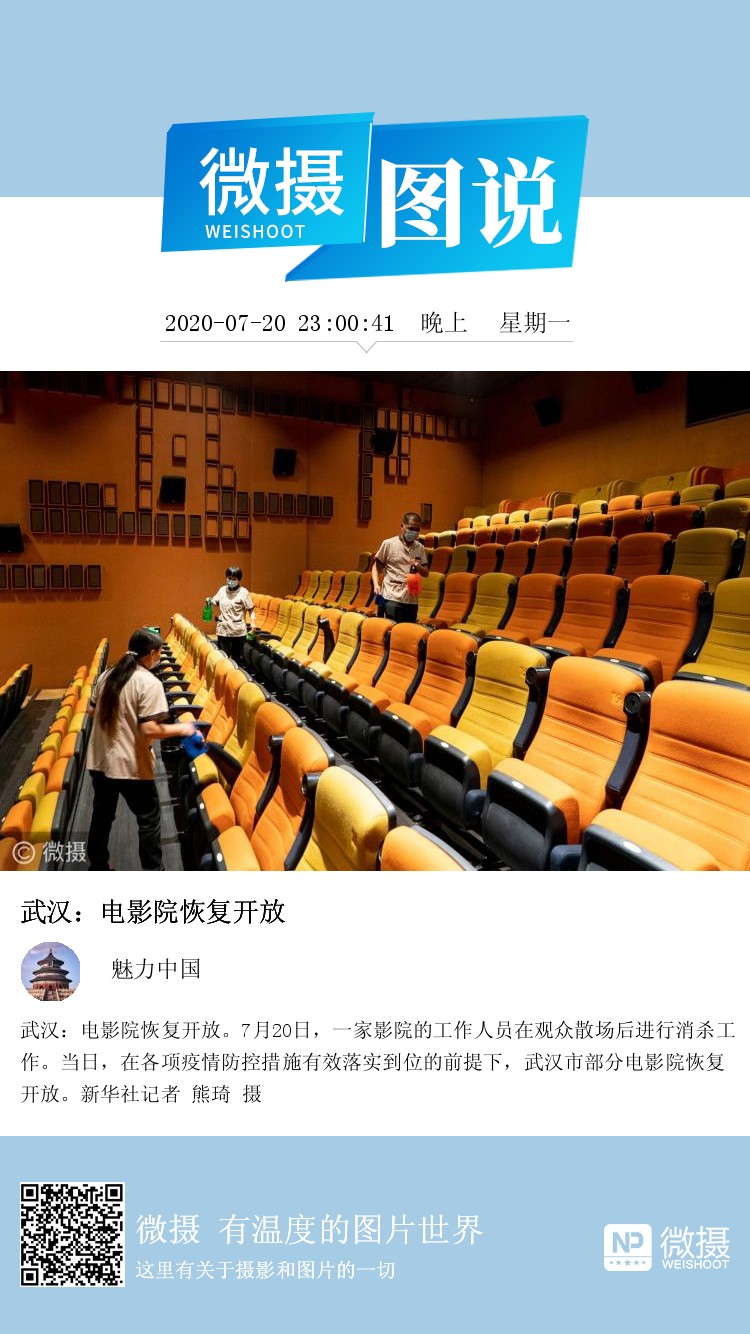 武汉:电影院恢复开放。7月20日,一家影院的工作人员在观众散场后进行消杀工作。当日,在各项疫情防控措施有效落实到位的前提下,武汉市部分电影院恢复开放。新华社记者 熊琦 摄