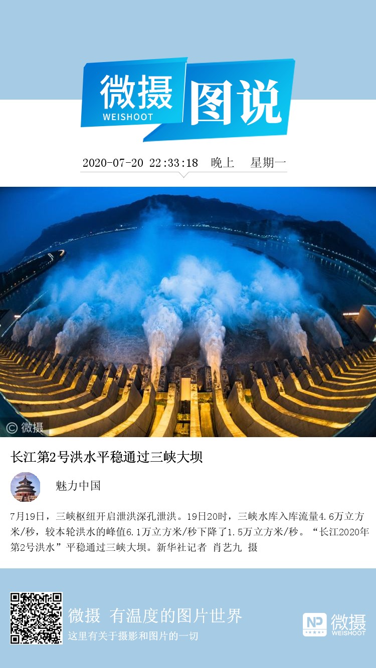7月19日,三峡枢纽开启泄洪深孔泄洪。19日20时,三峡水库入库流量4.6万立方米/秒,较本轮洪水的峰值6.1万立方米/秒下降了1.5万立方米/秒。“长江2020年第2号洪水”平稳通过三峡大坝。新华社记者 肖艺九 摄