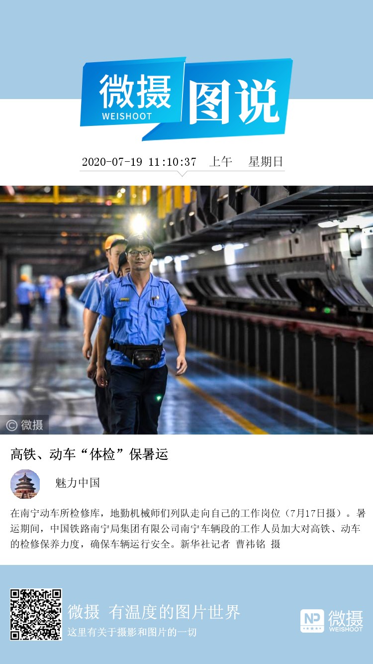 在南宁动车所检修库,地勤机械师们列队走向自己的工作岗位(7月17日摄)。暑运期间,中国铁路南宁局集团有限公司南宁车辆段的工作人员加大对高铁、动车的检修保养力度,确保车辆运行安全。新华社记者 曹祎铭 摄