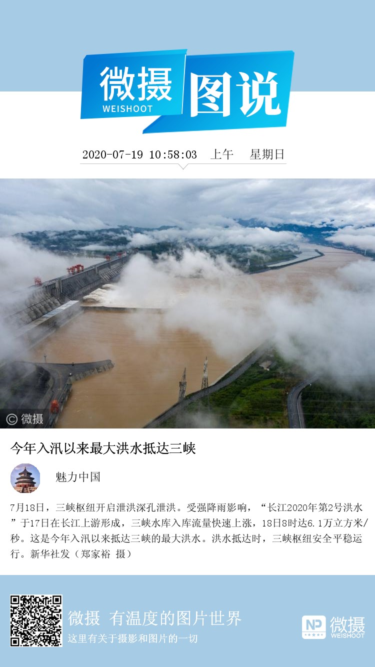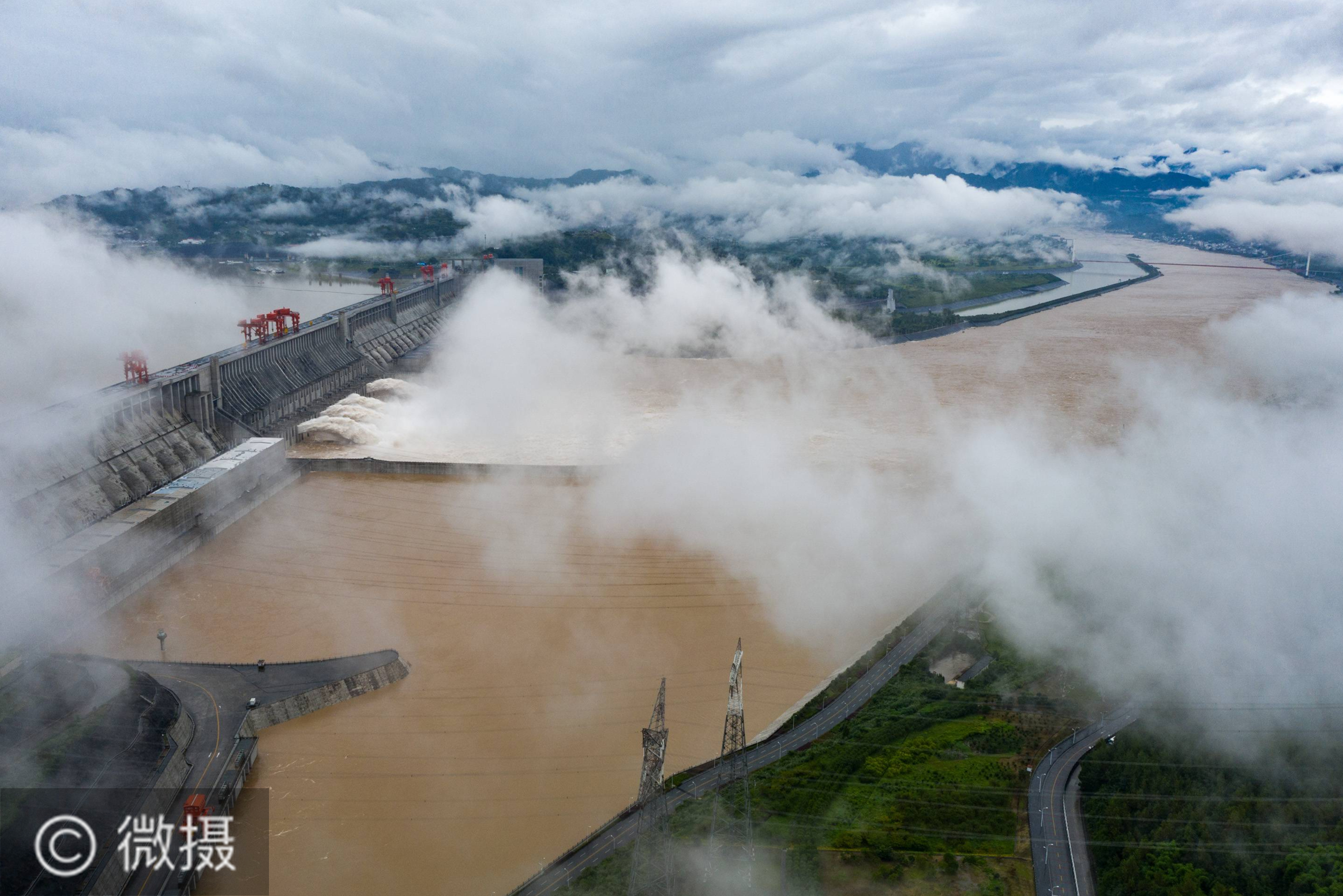 7月18日,三峡枢纽开启泄洪深孔泄洪。受强降雨影响,“长江2020年第2号洪水”于17日在长江上游形成,三峡水库入库流量快速上涨,18日8时达6.1万立方米/秒。这是今年入汛以来抵达三峡的最大洪水。洪水抵达时,三峡枢纽安全平稳运行。新华社发(郑家裕 摄)