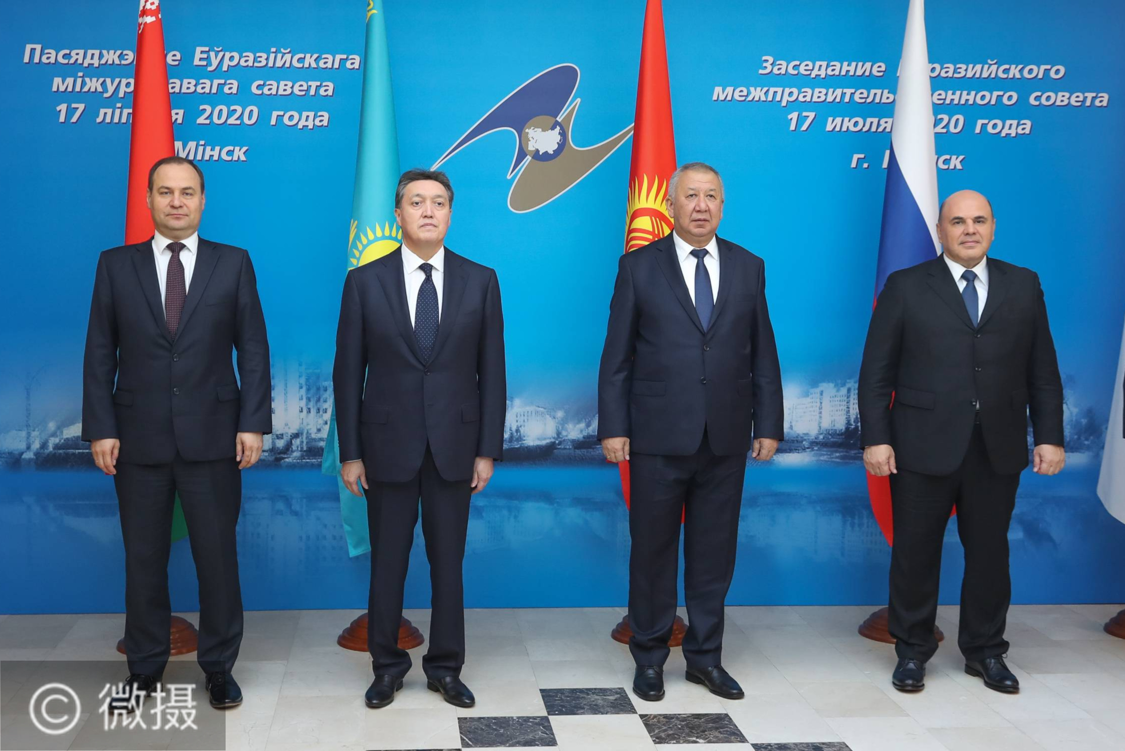 7月17日,亚美尼亚总理帕希尼扬、白俄罗斯总理戈洛夫琴科、哈萨克斯坦总理马明、吉尔吉斯斯坦总理博罗诺夫、俄罗斯总理米舒斯京和欧亚经济委员会执委会主席米亚斯尼科维奇(从左至右)在白俄罗斯首都明斯克举行的欧亚政府间理事会会议上合影。新华社发(欧亚经济委员会供图)