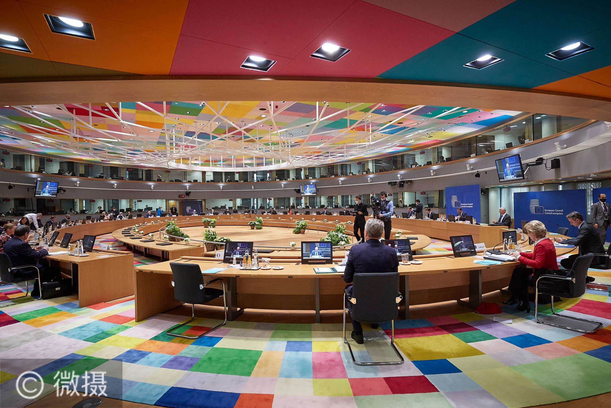 欧盟疫情后首个面对面峰会进入第二天。7月18日,欧盟成员国领导人在比利时布鲁塞尔出席欧盟特别峰会。7月17日至18日,欧盟成员国领导人在布鲁塞尔举行新冠疫情暴发后首个面对面峰会。新华社发(欧盟供图)