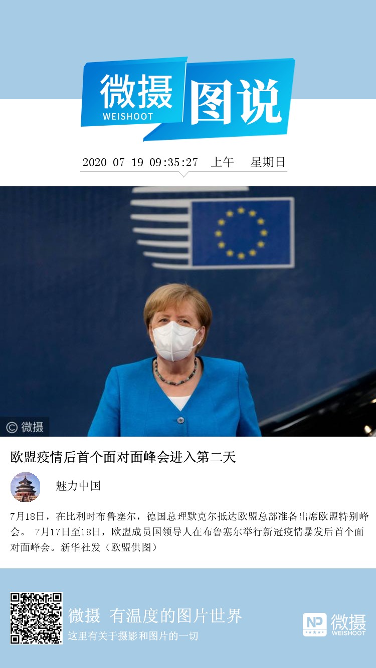 7月18日,在比利时布鲁塞尔,德国总理默克尔抵达欧盟总部准备出席欧盟特别峰会。 7月17日至18日,欧盟成员国领导人在布鲁塞尔举行新冠疫情暴发后首个面对面峰会。新华社发(欧盟供图)