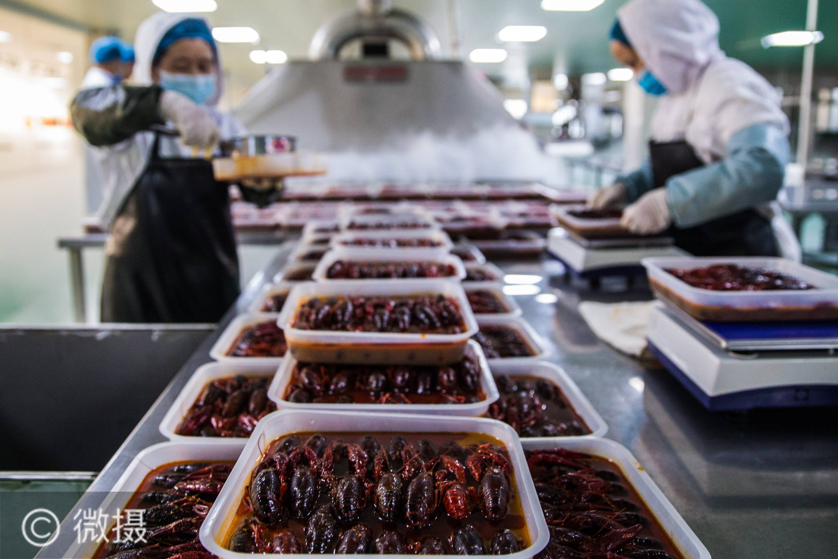 7月18日,在泗洪县半城镇工业园区小龙虾产业化联合体加工车间,工人给蒸煮后的小龙虾浇汁。江苏省宿迁市泗洪县稻(藕)田养殖小龙虾近30万亩。近期,泗洪县采取“电商+农民专业合作社+虾农”方式组建小龙虾产业化联合体,加盟的千余户虾农每年增收超过400万元。新华社发(许昌亮 摄)