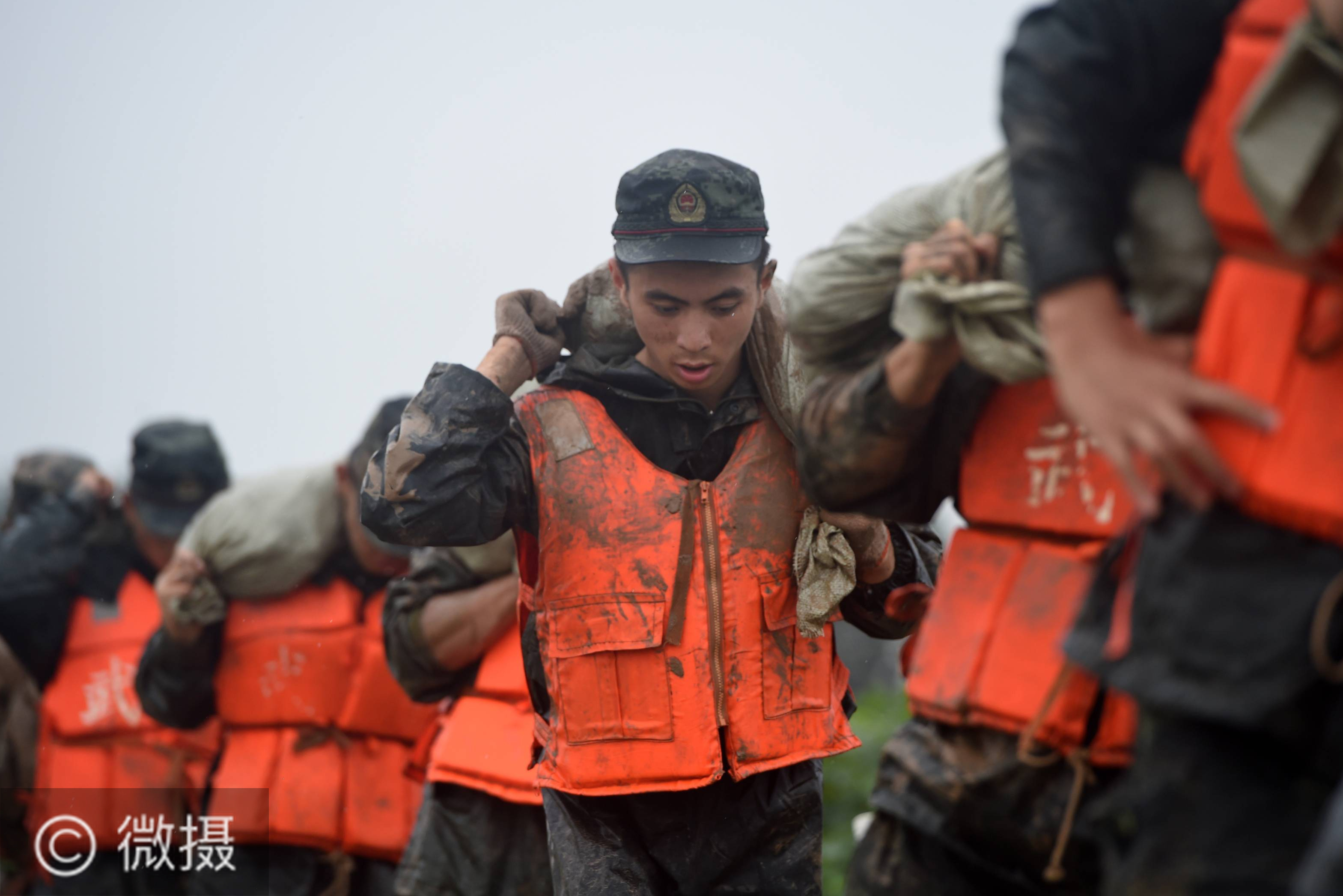 7月18日,在位于安徽省和县黄坝村的石跋河堤坝上,武警安徽总队马鞍山支队的官兵在搬运沙袋。受连日强降雨影响,位于安徽省马鞍山市和县境内的长江支流石跋河水位持续上升。7月18日,石跋河水位达到11.24米,武警安徽总队马鞍山支队紧急出动兵力,保障河堤安全。新华社记者 周牧 摄