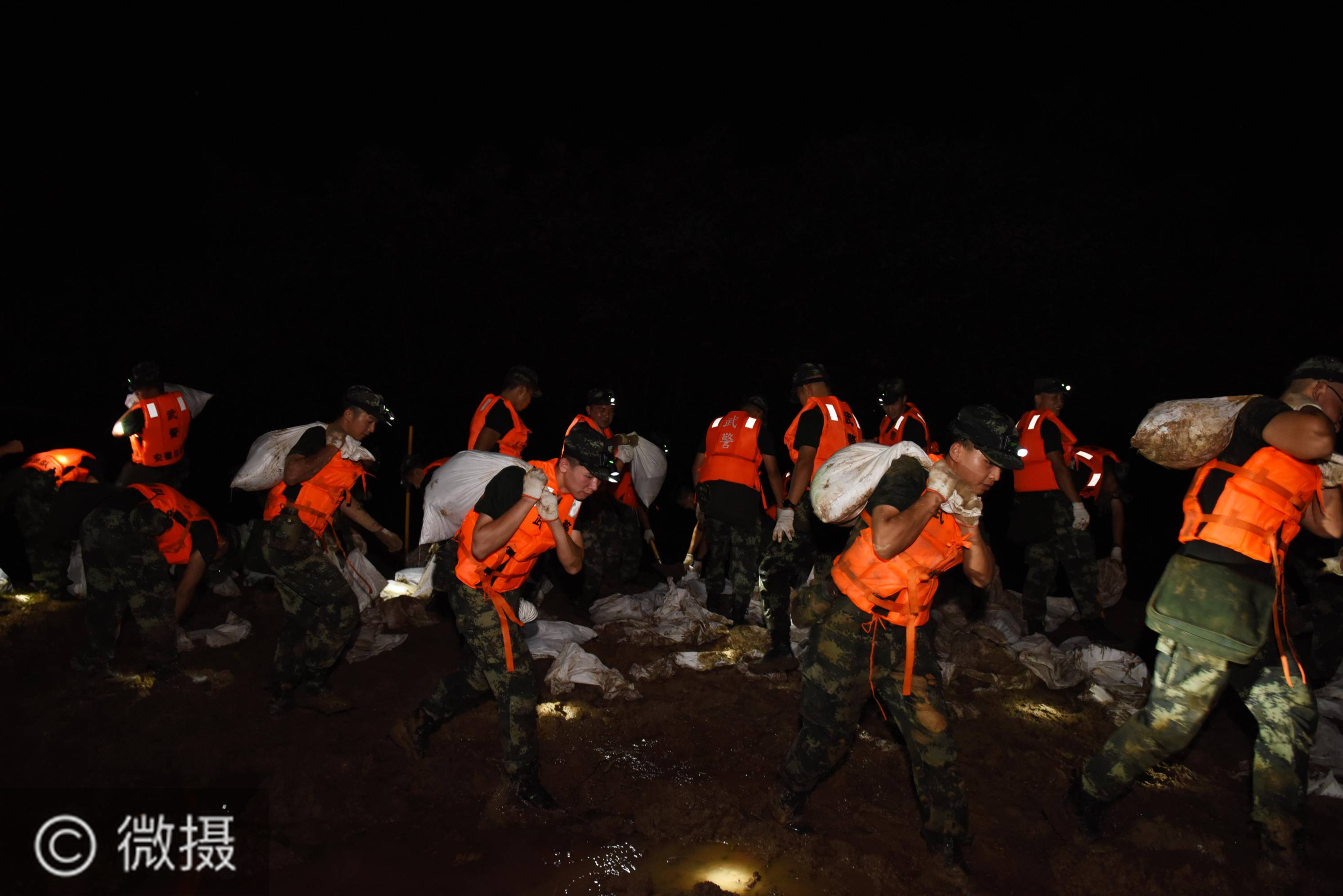 洪水不退,子弟兵誓死不退——解放军和武警部队官兵参与洪涝灾害抢险救援记事。7月14日,武警安徽总队合肥支队官兵在铜陵义安区西联镇老观圩扛运沙袋。新华社发(徐伟 摄)