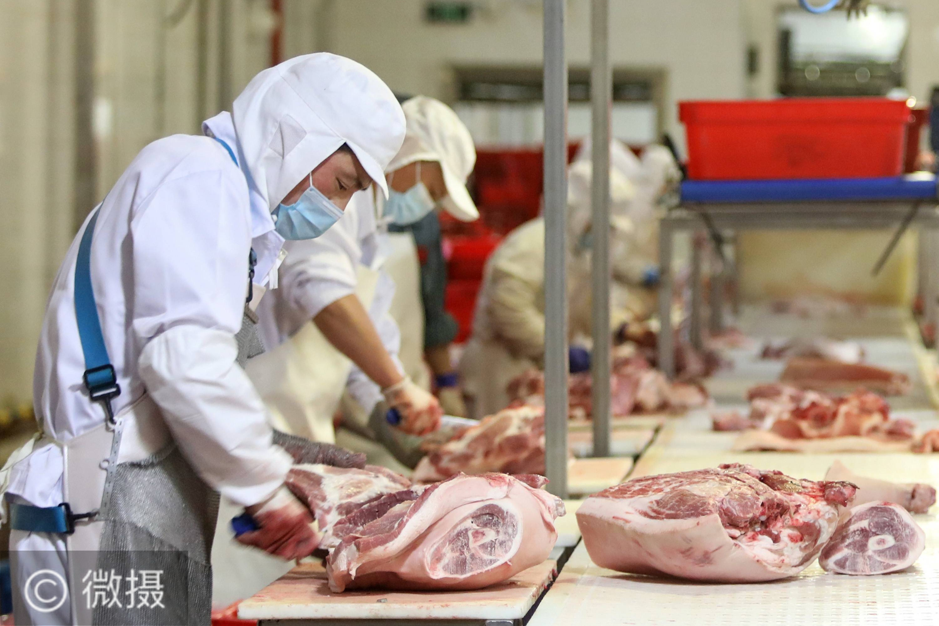 7月15日,北京二商肉类食品集团有限公司员工在肉类分割流水线上工作。新冠肺炎疫情以来,企业严格实施北京市、农业农村部和中国肉类协会的防疫要求,对进入厂区的人员、车辆以及原料采购、屠宰分割、产品加工、等环节严格防疫,强调源头把关彻底消毒。新华社记者 李欣 摄