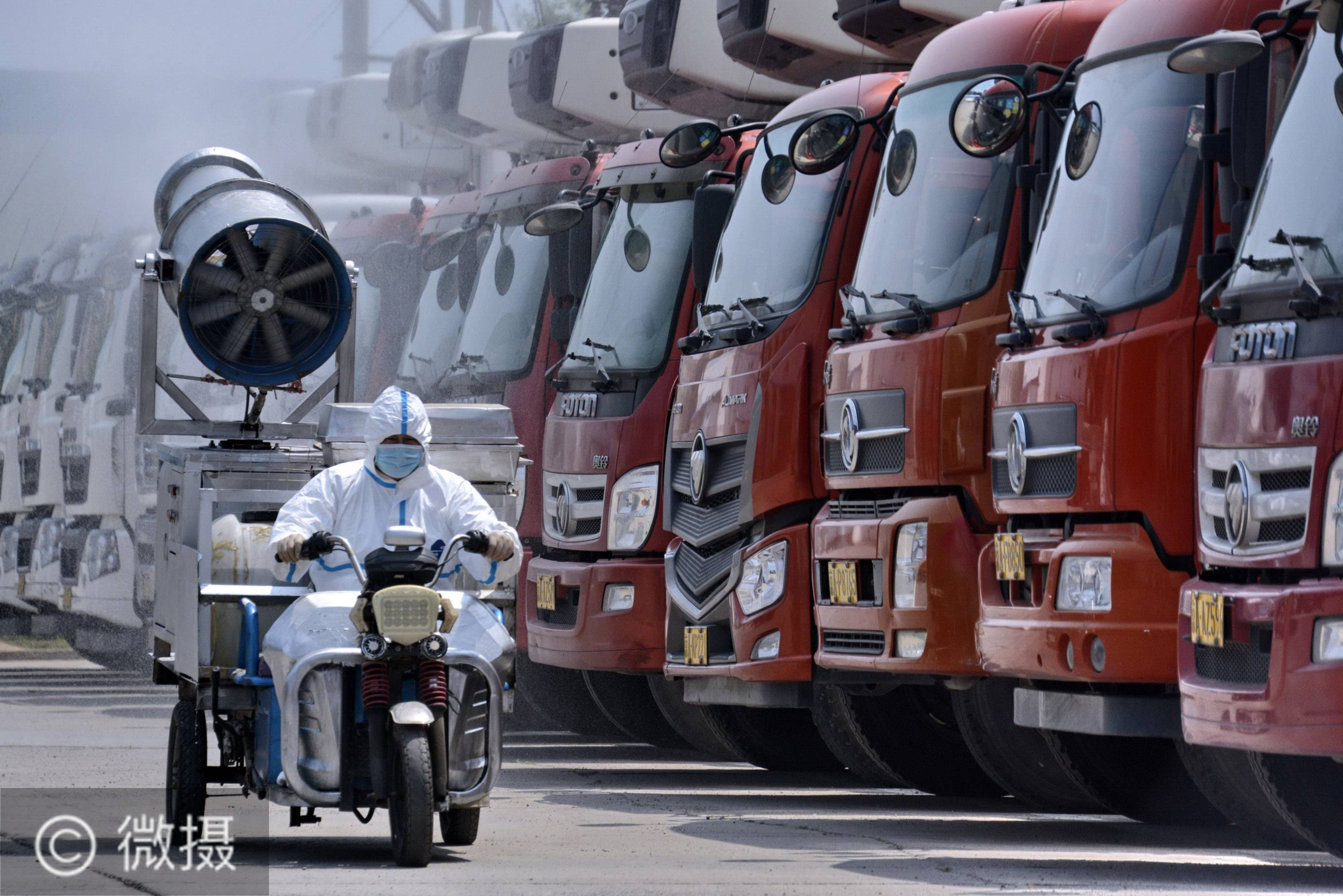 7月14日,北京二商肉类食品集团有限公司员工在对肉类运输车辆停靠区域进行防疫消毒。新冠肺炎疫情以来,企业严格实施北京市、农业农村部和中国肉类协会的防疫要求,对进入厂区的人员、车辆以及原料采购、屠宰分割、产品加工、等环节严格防疫,强调源头把关彻底消毒。新华社记者 李欣 摄