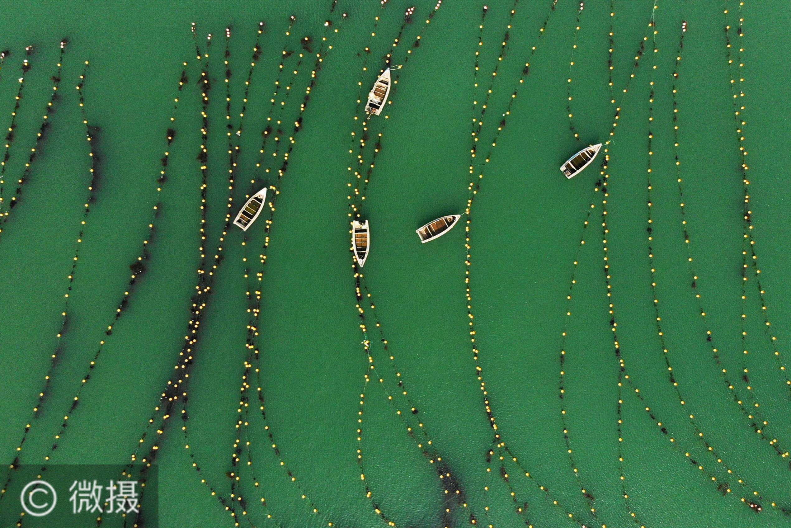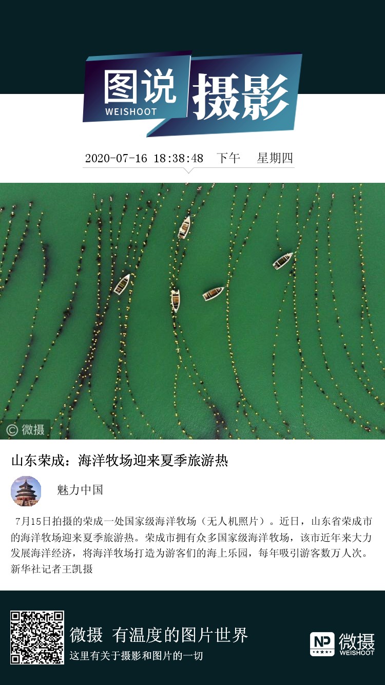7月15日拍摄的荣成一处国家级海洋牧场(无人机照片)。近日,山东省荣成市的海洋牧场迎来夏季旅游热。荣成市拥有众多国家级海洋牧场,该市近年来大力发展海洋经济,将海洋牧场打造为游客们的海上乐园,每年吸引游客数万人次。新华社记者王凯摄