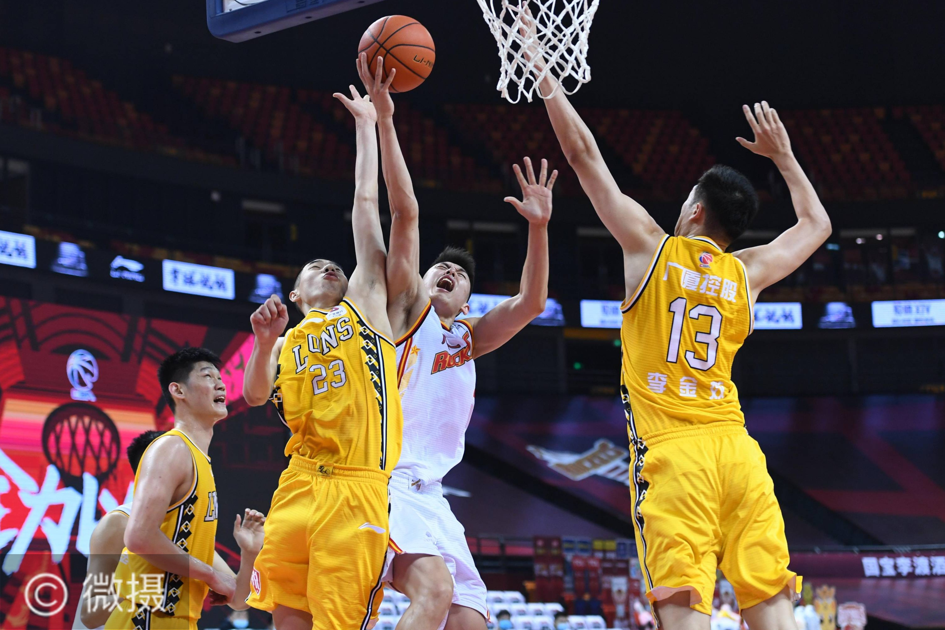 7月14日,浙江广厦控股队球员朱俊龙(左二)、李金效(右一)在比赛中防守八一南昌队球员马泳(右二)。当日,在山东青岛举行的2019-2020赛季中国男子篮球职业联赛(CBA)复赛第二阶段(红岛赛区)比赛中,浙江广厦控股队以113比105战胜八一南昌队。新华社记者 朱峥 摄