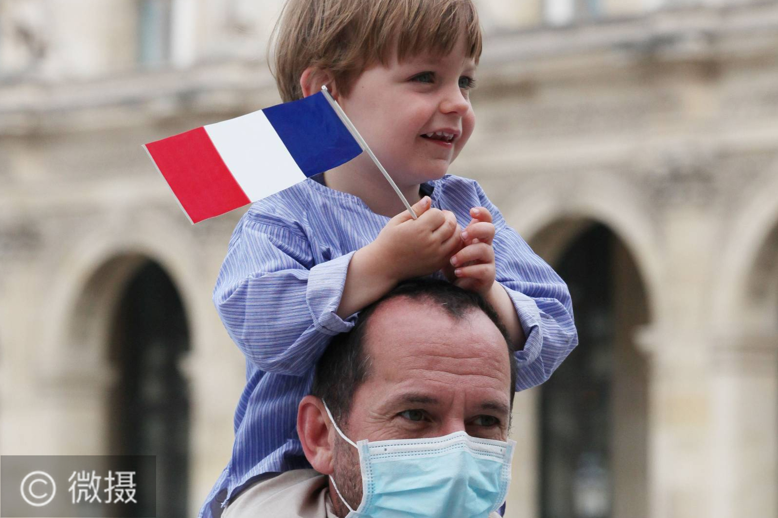 7月14日,在法国巴黎卢浮宫玻璃金字塔广场,一对父子观看国庆阅兵式的飞行表演。法国一年一度的国庆阅兵式14日在巴黎举行。受疫情影响,法国总统马克龙没有在香榭丽舍大街举行国庆阅兵式,而是在协和广场举行小型庆祝仪式,向在抗疫斗争中做出贡献的公民致敬。新华社记者 高静 摄