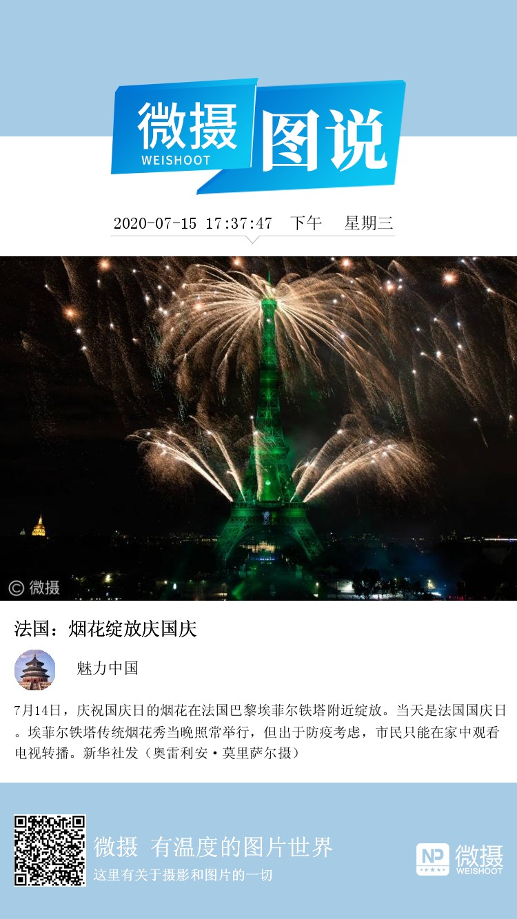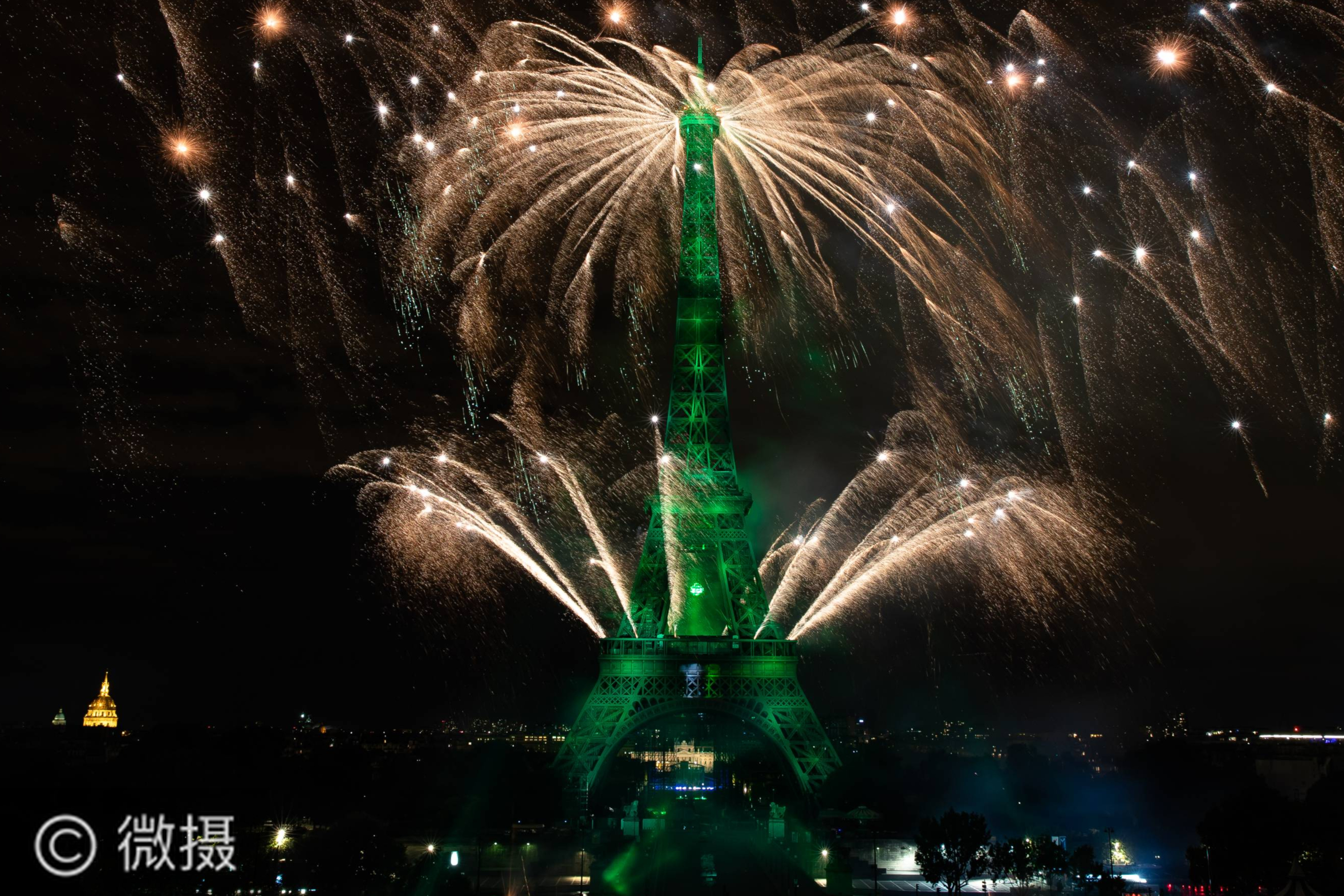 7月14日,庆祝国庆日的烟花在法国巴黎埃菲尔铁塔附近绽放。当天是法国国庆日。埃菲尔铁塔传统烟花秀当晚照常举行,但出于防疫考虑,市民只能在家中观看电视转播。新华社发(奥雷利安·莫里萨尔摄)