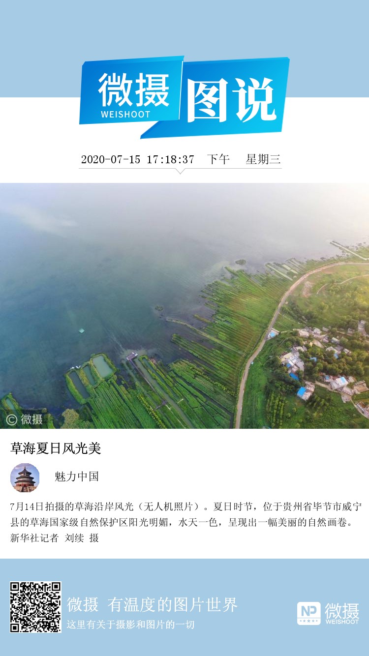 7月14日拍摄的草海沿岸风光(无人机照片)。夏日时节,位于贵州省毕节市威宁县的草海国家级自然保护区阳光明媚,水天一色,呈现出一幅美丽的自然画卷。新华社记者 刘续 摄