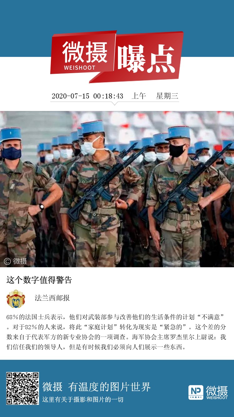 68%的法国士兵表示,他们对武装部参与改善他们的生活条件的计划“不满意”。对于82%的人来说,将此“家庭计划”转化为现实是“紧急的”。这个差的分数来自于代表军方的新专业协会的一项调查。海军协会主席罗杰里尔上尉说:我们信任我们的领导人,但是有时候我们必须向人们展示一些东西。