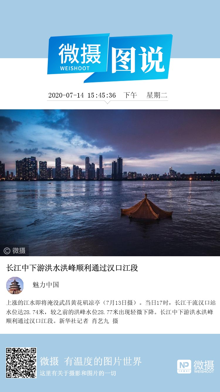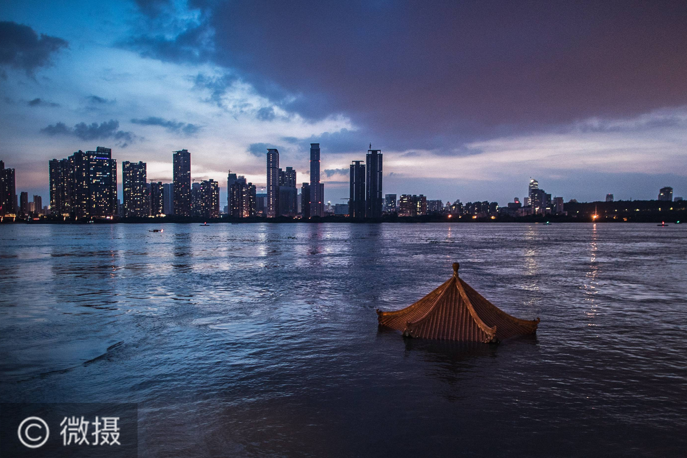 上涨的江水即将淹没武昌黄花矶凉亭(7月13日摄)。当日17时,长江干流汉口站水位达28.74米,较之前的洪峰水位28.77米出现轻微下降。长江中下游洪水洪峰顺利通过汉口江段。新华社记者 肖艺九 摄