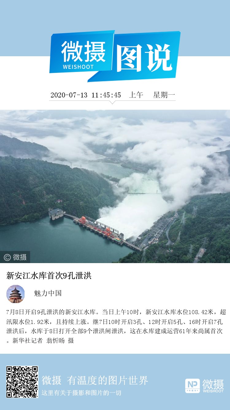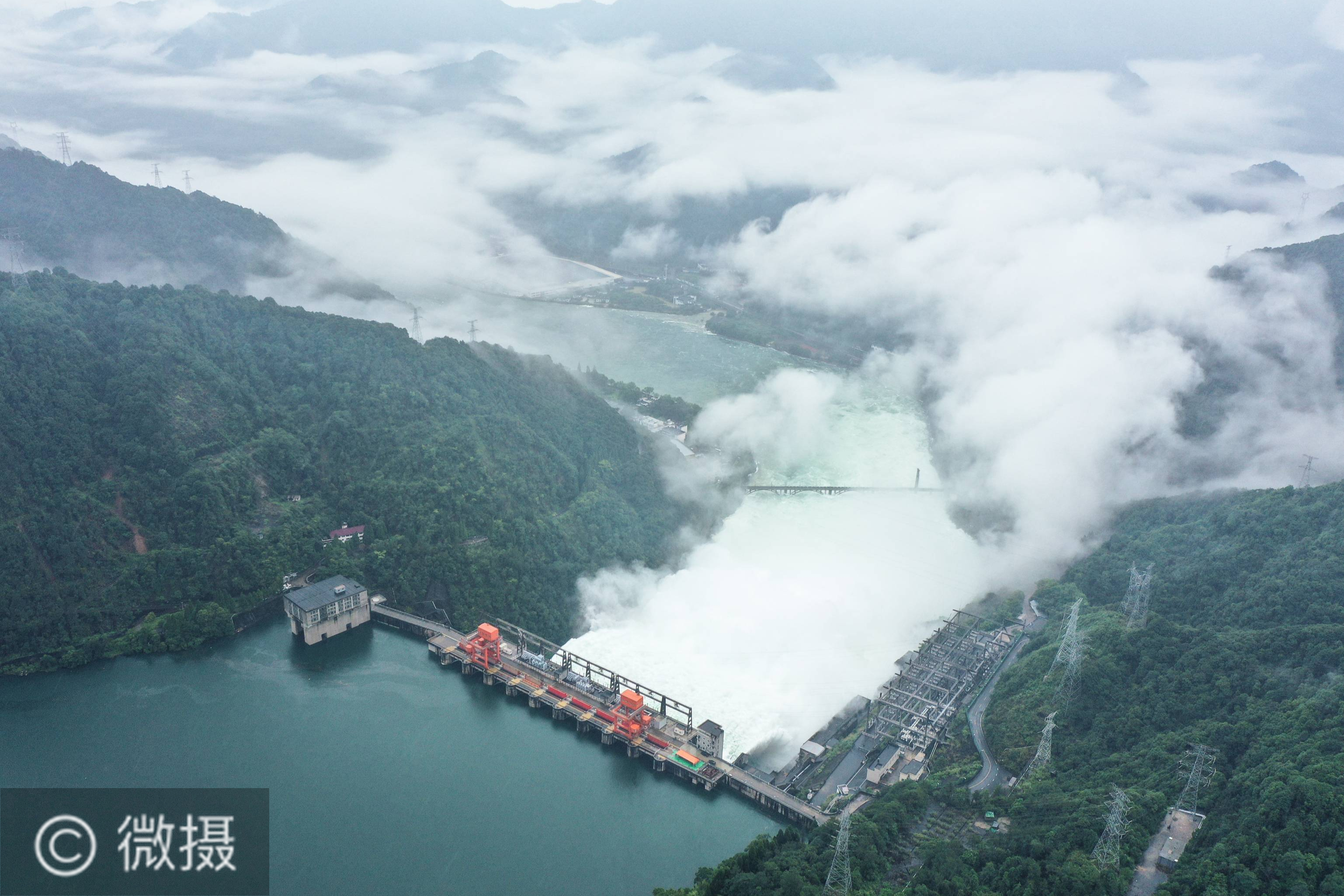 7月8日开启9孔泄洪的新安江水库。当日上午10时,新安江水库水位108.42米,超汛限水位1.92米,且持续上涨。继7日10时开启3孔、12时开启5孔、16时开启7孔泄洪后,水库于8日打开全部9个泄洪闸泄洪,这在水库建成运营61年来尚属首次。新华社记者 翁忻旸 摄