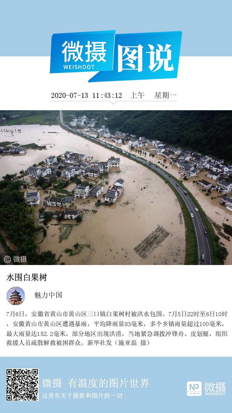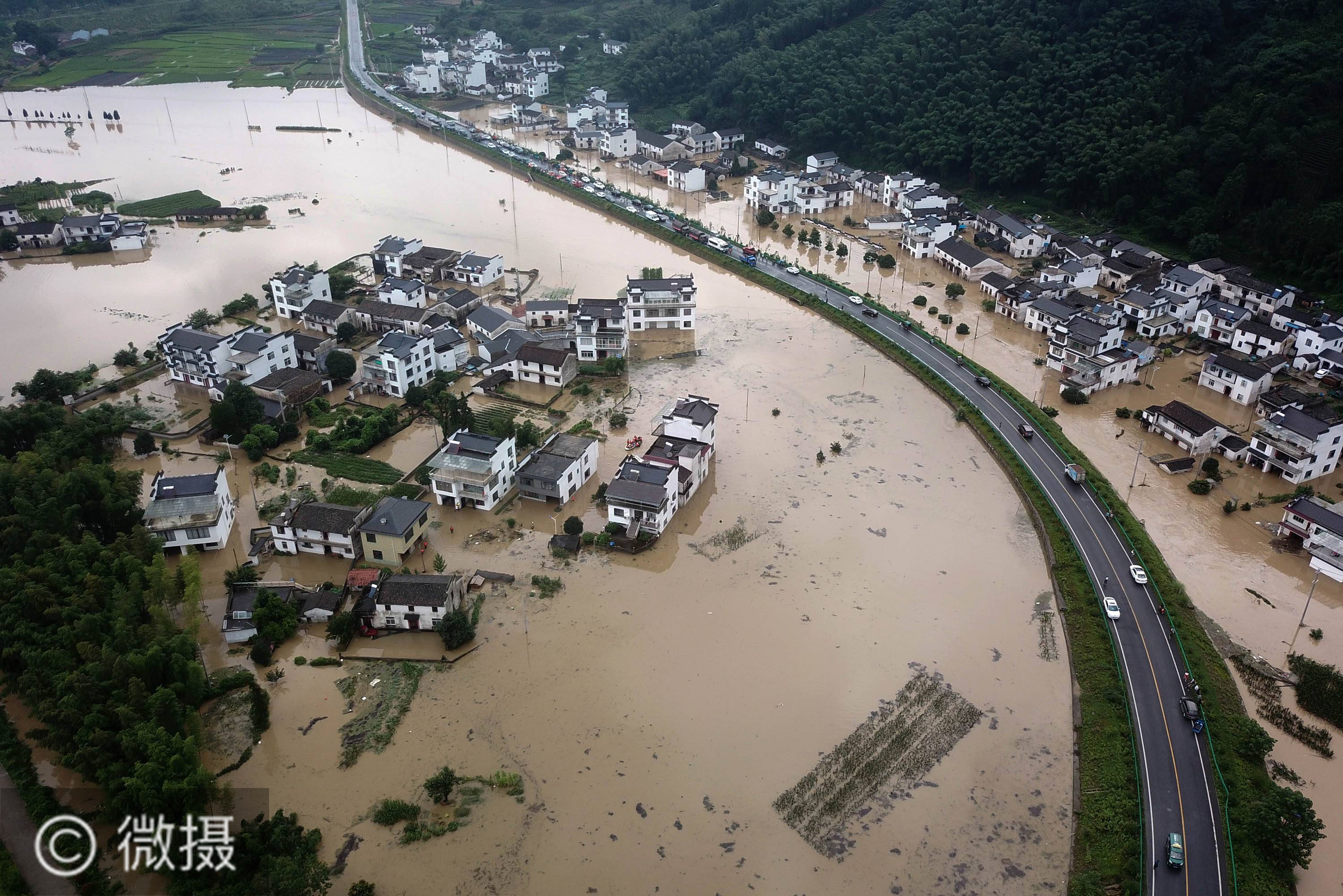 7月6日,安徽省黄山市黄山区三口镇白果树村被洪水包围。7月5日22时至6日10时,安徽黄山市黄山区遭遇暴雨,平均降雨量83毫米,多个乡镇雨量超过100毫米,最大雨量达152.2毫米,部分地区出现洪涝,当地紧急调拨冲锋舟、皮划艇,组织救援人员疏散解救被困群众。新华社发(施亚磊 摄)