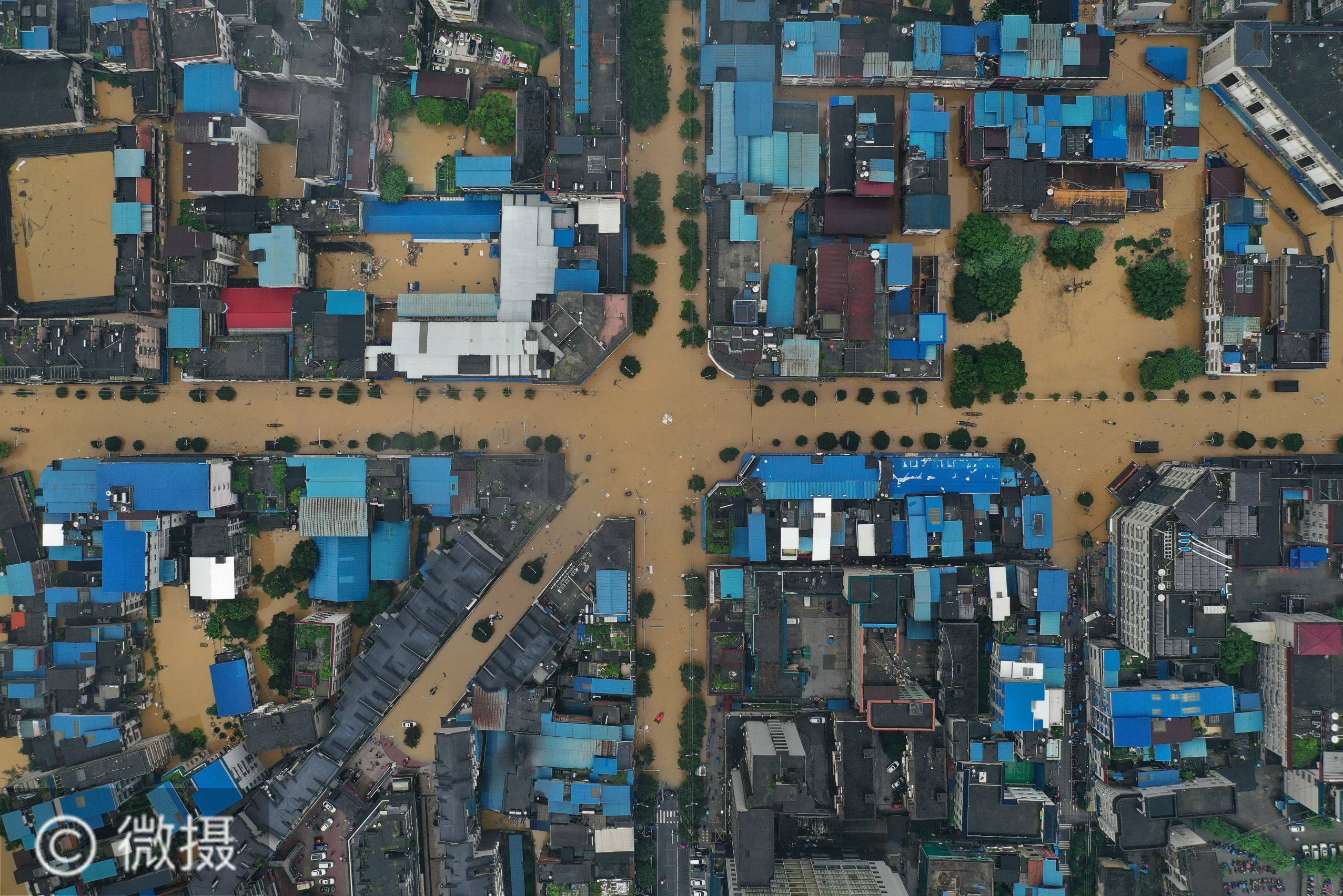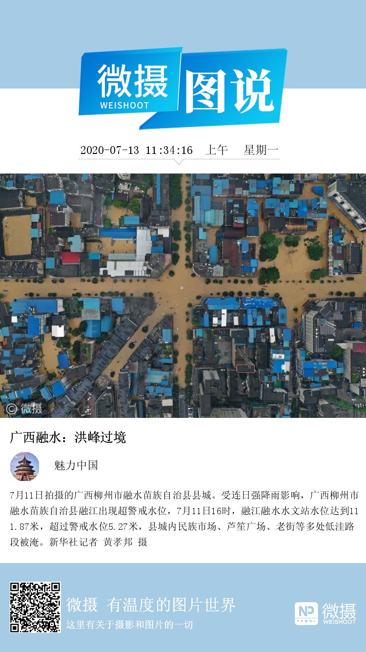 7月11日拍摄的广西柳州市融水苗族自治县县城。受连日强降雨影响,广西柳州市融水苗族自治县融江出现超警戒水位,7月11日16时,融江融水水文站水位达到111.87米,超过警戒水位5.27米,县城内民族市场、芦笙广场、老街等多处低洼路段被淹。新华社记者 黄孝邦 摄