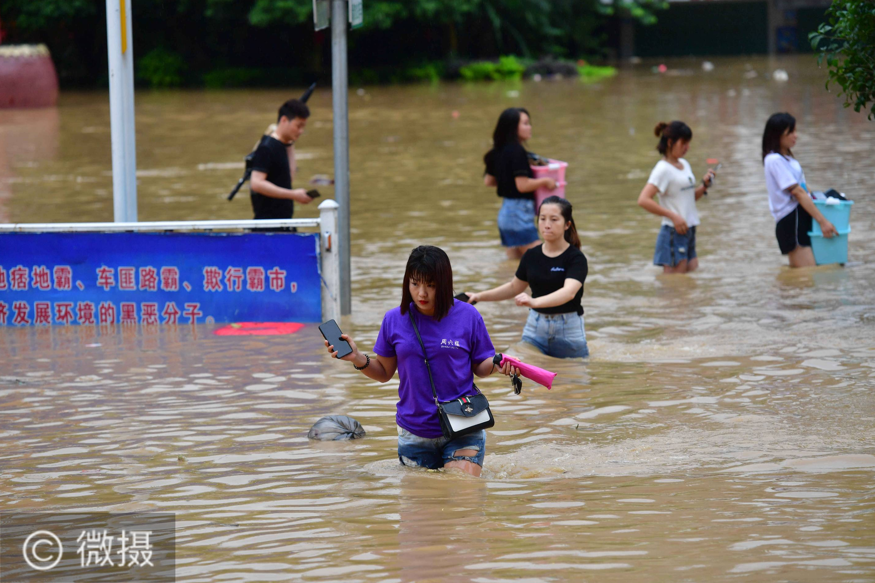 7月11日,在广西融水苗族自治县县城,居民在洪水中转移。受连日强降雨影响,广西柳州市融水苗族自治县融江出现超警戒水位,7月11日16时,融江融水水文站水位达到111.87米,超过警戒水位5.27米,县城内民族市场、芦笙广场、老街等多处低洼路段被淹。新华社记者 黄孝邦 摄