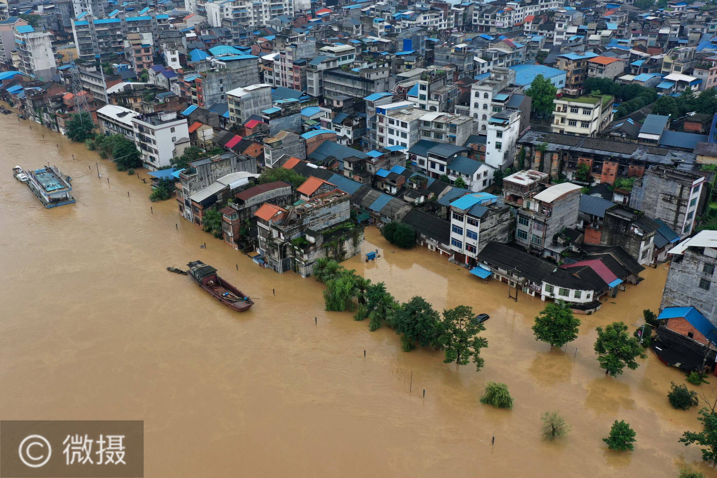 强降雨引发广西融江水位暴涨。这是融江融安段的洪水(7月11日摄,无人机照片)。受持续强降雨影响,广西融江水位暴涨。新华社记者 张爱林 摄 新华社照片,融安(广西),2020年7月11日