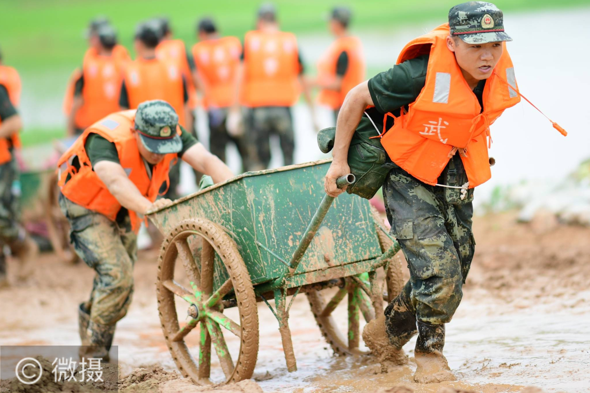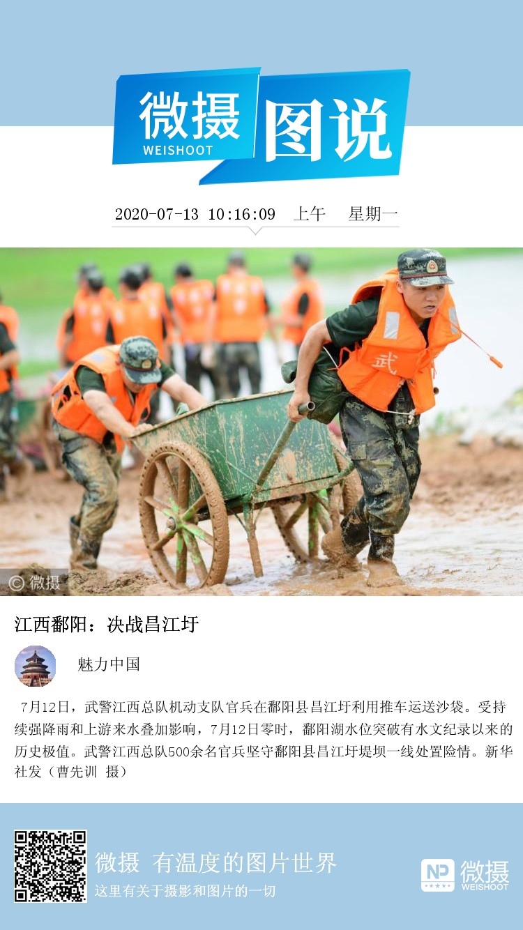 7月12日,武警江西总队机动支队官兵在鄱阳县昌江圩利用推车运送沙袋。受持续强降雨和上游来水叠加影响,7月12日零时,鄱阳湖水位突破有水文纪录以来的历史极值。武警江西总队500余名官兵坚守鄱阳县昌江圩堤坝一线处置险情。新华社发(曹先训 摄)