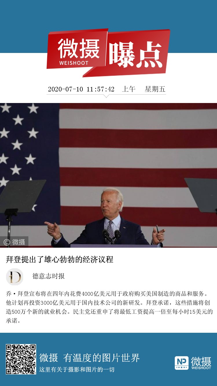 乔·拜登宣布将在四年内花费4000亿美元用于政府购买美国制造的商品和服务。他计划再投资3000亿美元用于国内技术公司的新研发。拜登承诺,这些措施将创造500万个新的就业机会。民主党还重申了将最低工资提高一倍至每小时15美元的承诺。