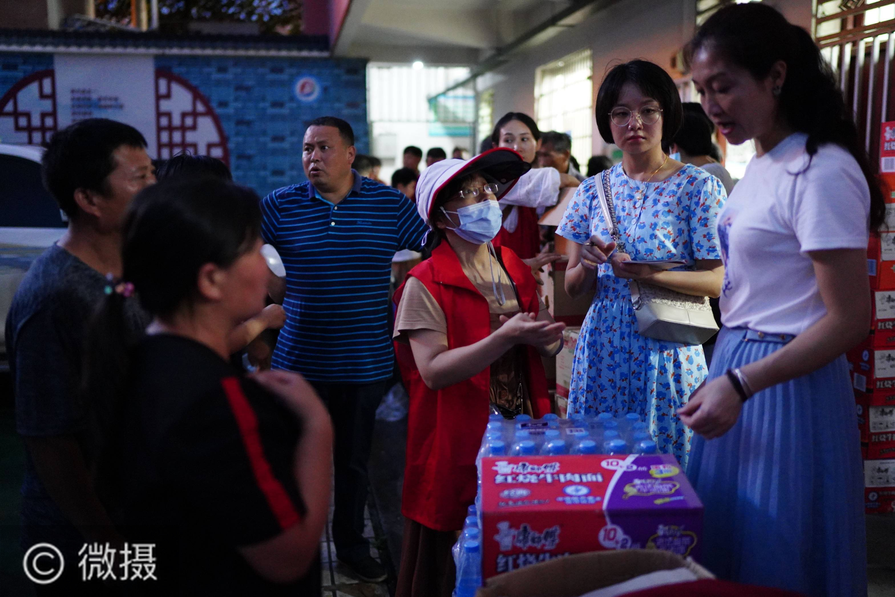7月9日,志愿者和工作人员为村民分配物资。当日,江西鄱阳县鄱阳镇因洪水受灾的村民被转移到多个集中安置点。在鄱阳县五一中心学校安置点,志愿者和工作人员接到任务后不到十小时内,为被转移村民布置了28间教室,并为村民发放褥子、床单、枕头、盒饭、饮用水等物资。新华社记者 周密 摄