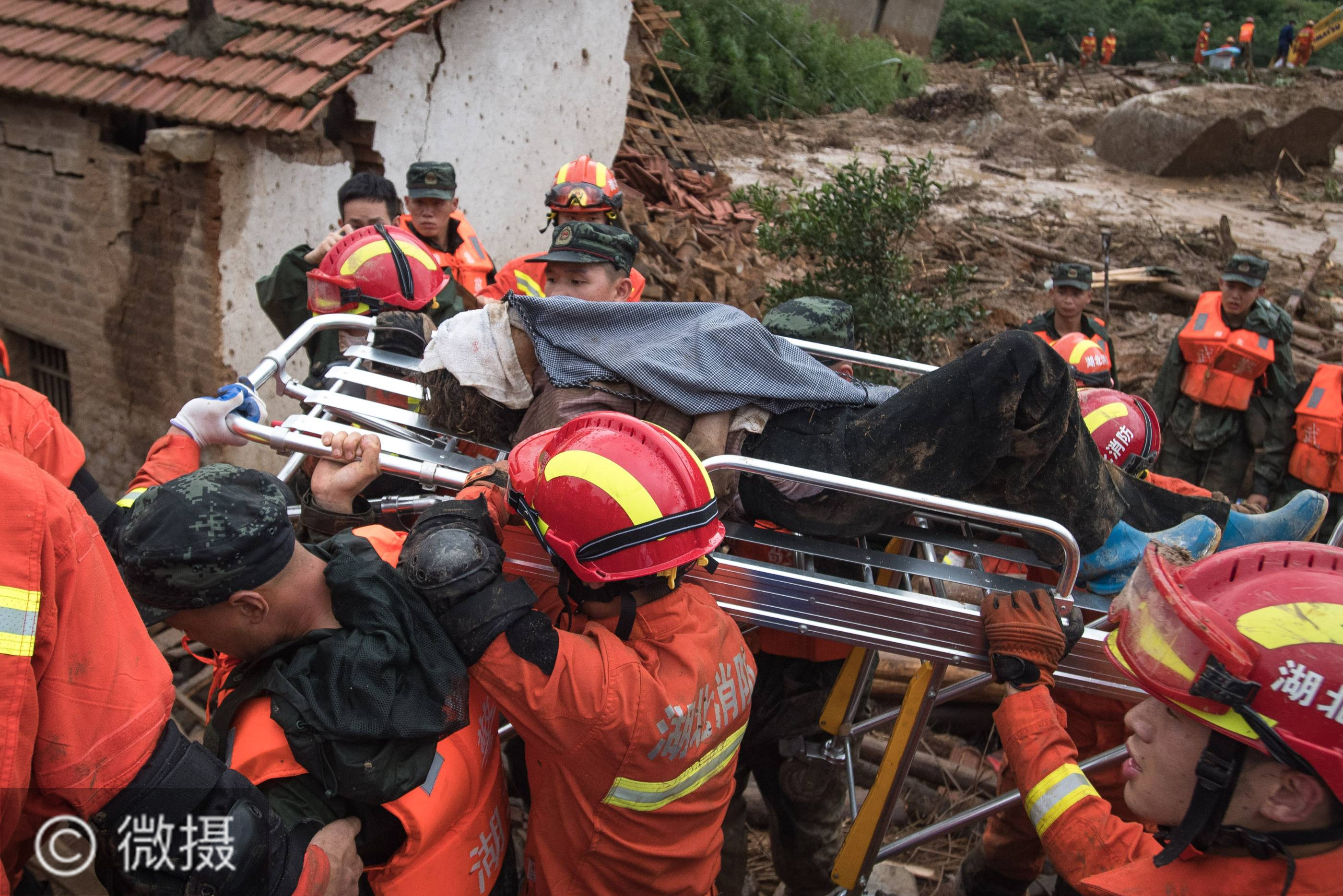 7月8日,救援人员在转移从山体滑坡现场救出的八旬老人。经过近200名救援人员夜以继日的奋力搜救,湖北省黄梅县大河镇袁山村山体滑坡事故9名被困者已全部被搜寻出来。遗憾的是,仅有1人生还。新华社记者 肖艺九 摄