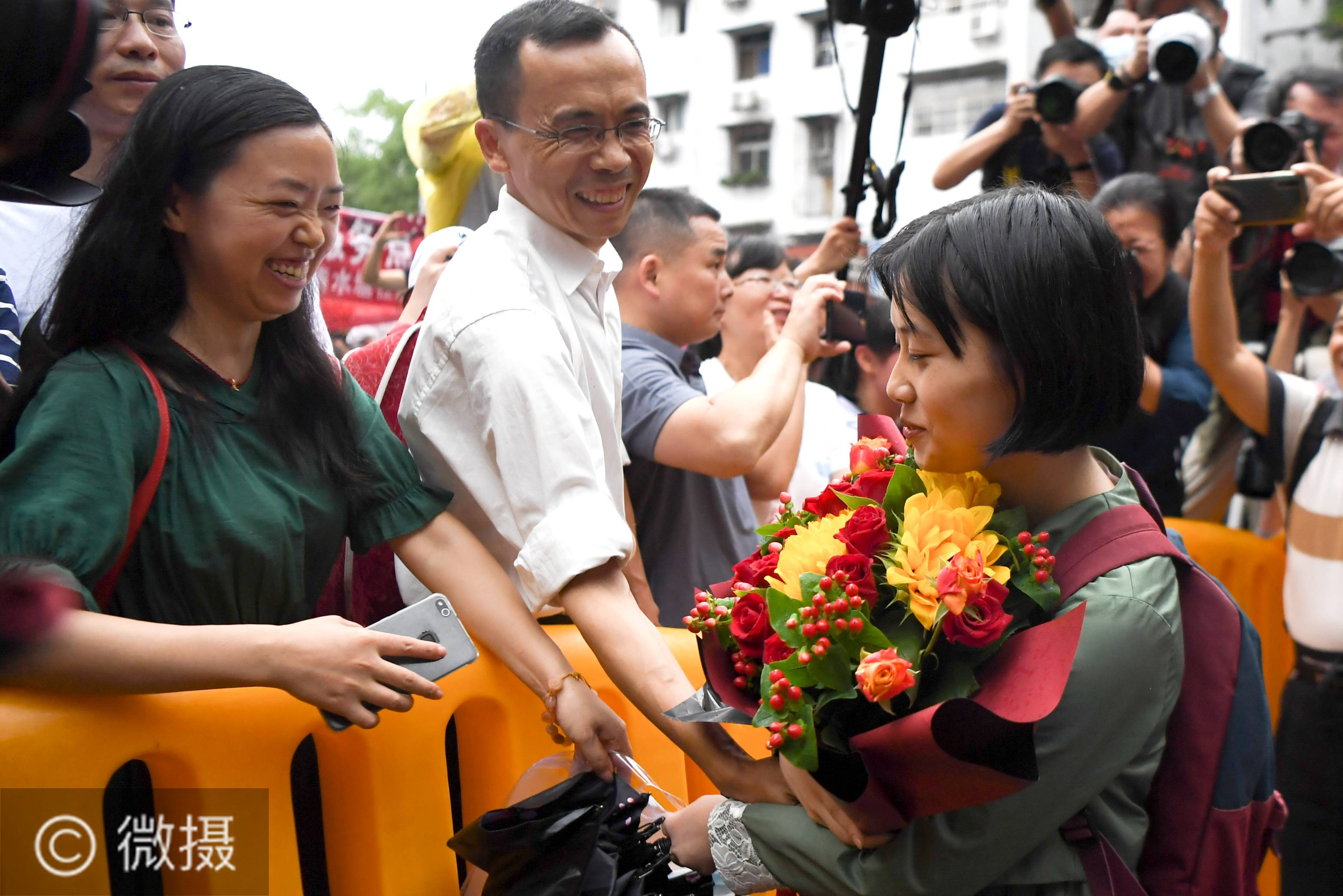 全国部分地区2020年高考结束。7月8日,一名考生(右)在湖南省长沙市一中考点外从家长手中接过鲜花。当日,全国部分地区2020年高考结束。新华社记者 薛宇舸 摄 新华社照片,长沙,2020年7月8日