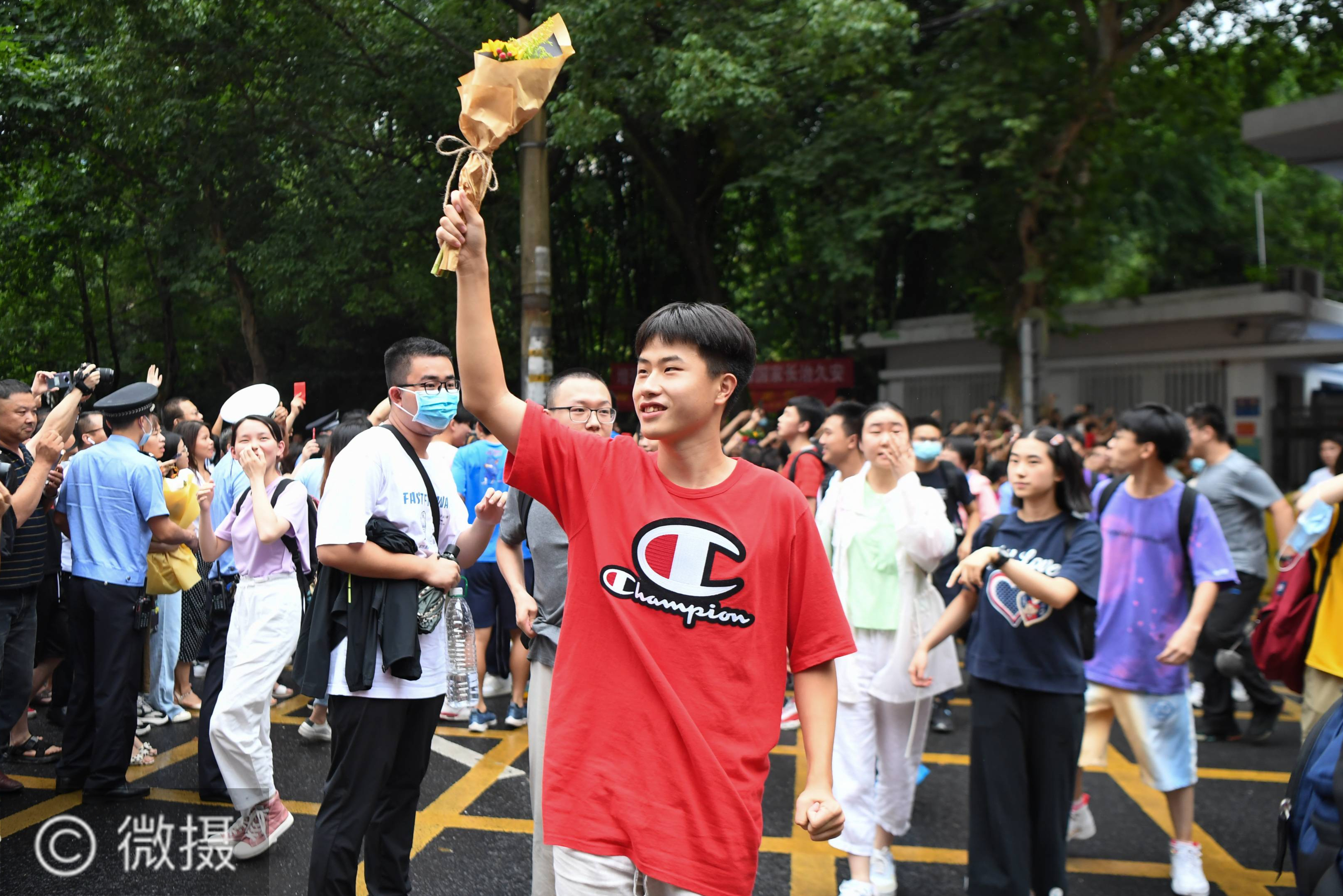 全国部分地区2020年高考结束。7月8日,考生拿着鲜花向湖南省长沙市一中考点外等候的家长示意。当日,全国部分地区2020年高考结束。新华社记者 薛宇舸 摄 新华社照片,长沙,2020年7月8日