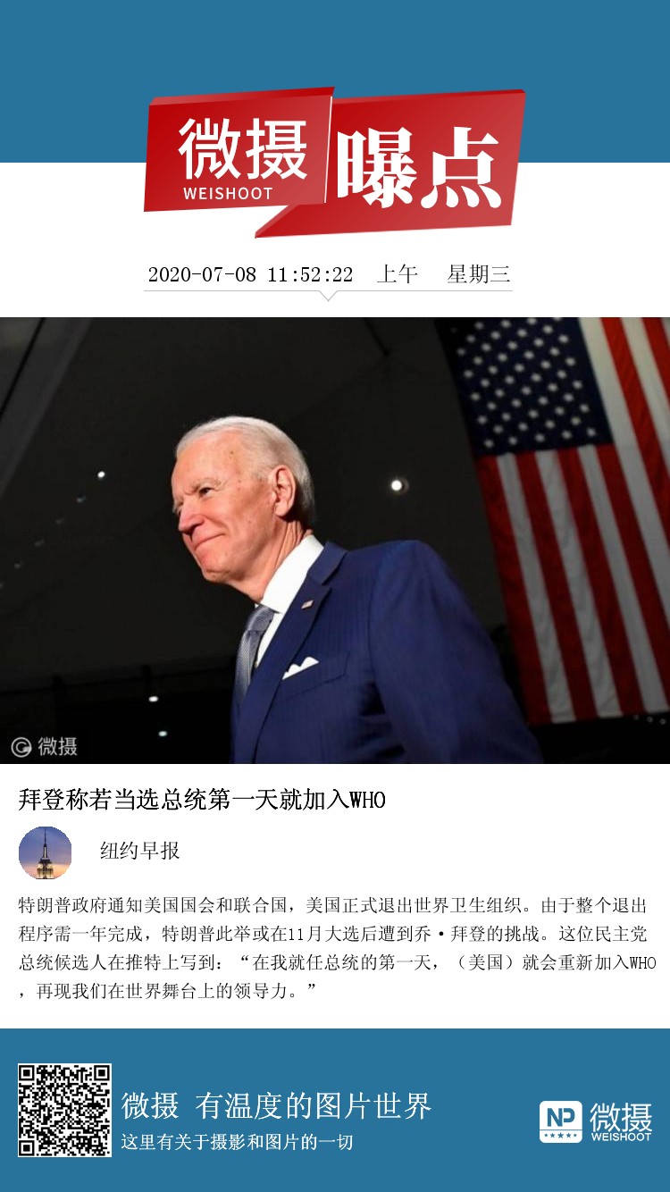 特朗普政府通知美国国会和联合国,美国正式退出世界卫生组织。由于整个退出程序需一年完成,特朗普此举或在11月大选后遭到乔·拜登的挑战。这位民主党总统候选人在推特上写到:“在我就任总统的第一天,(美国)就会重新加入WHO,再现我们在世界舞台上的领导力。”