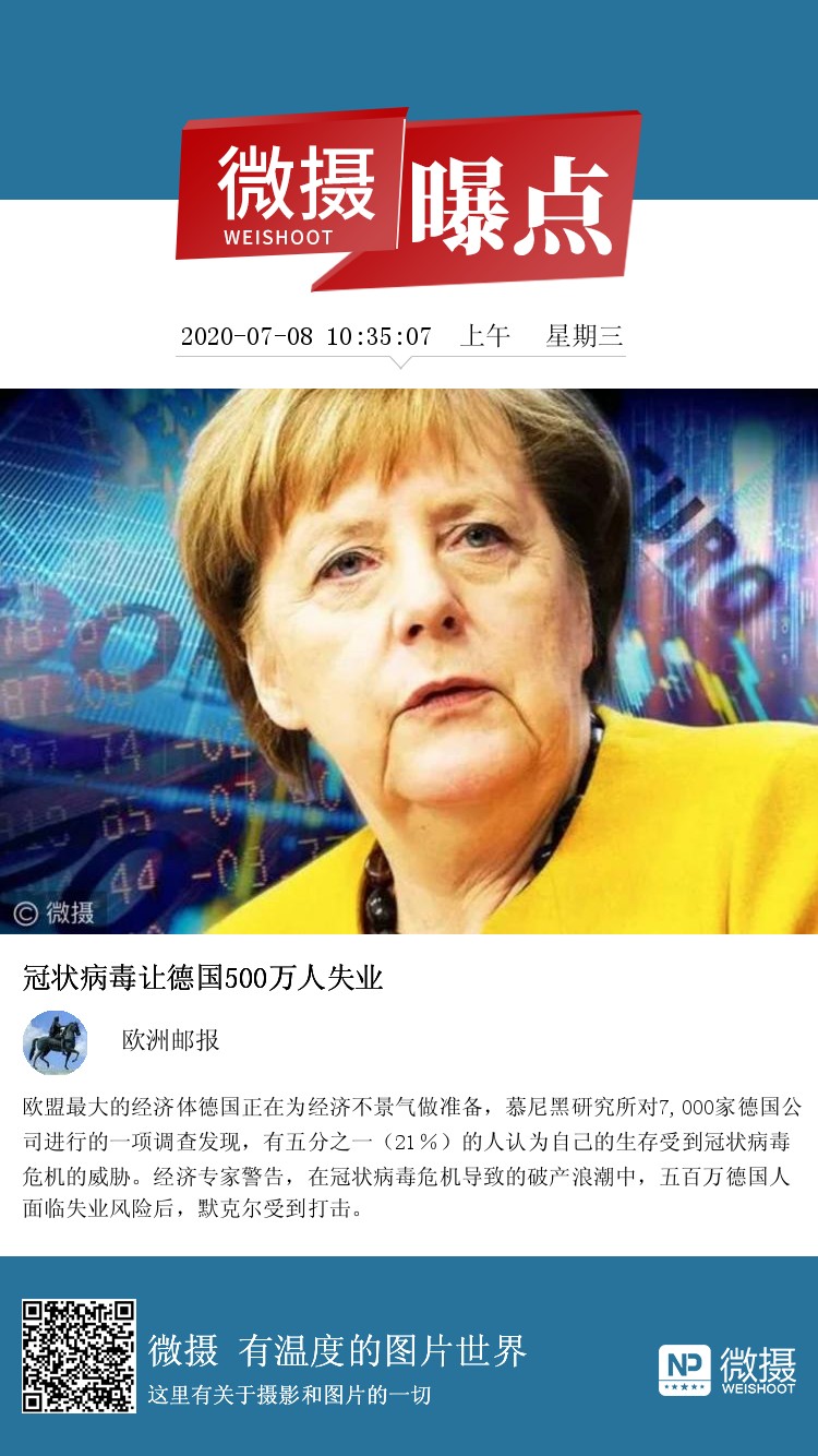 欧盟最大的经济体德国正在为经济不景气做准备,慕尼黑研究所对7,000家德国公司进行的一项调查发现,有五分之一(21%)的人认为自己的生存受到冠状病毒危机的威胁。经济专家警告,在冠状病毒危机导致的破产浪潮中,五百万德国人面临失业风险后,默克尔受到打击。