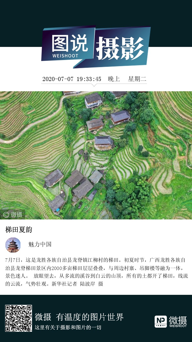 7月7日,这是龙胜各族自治县龙脊镇江柳村的梯田。初夏时节,广西龙胜各族自治县龙脊梯田景区内2000多亩梯田层层叠叠,与周边村寨、吊脚楼等融为一体,景色迷人。 放眼望去,从多流的溪谷到白云的山顶,所有的土都开了梯田,线流的云流,气势壮观。新华社记者 陆波岸 摄