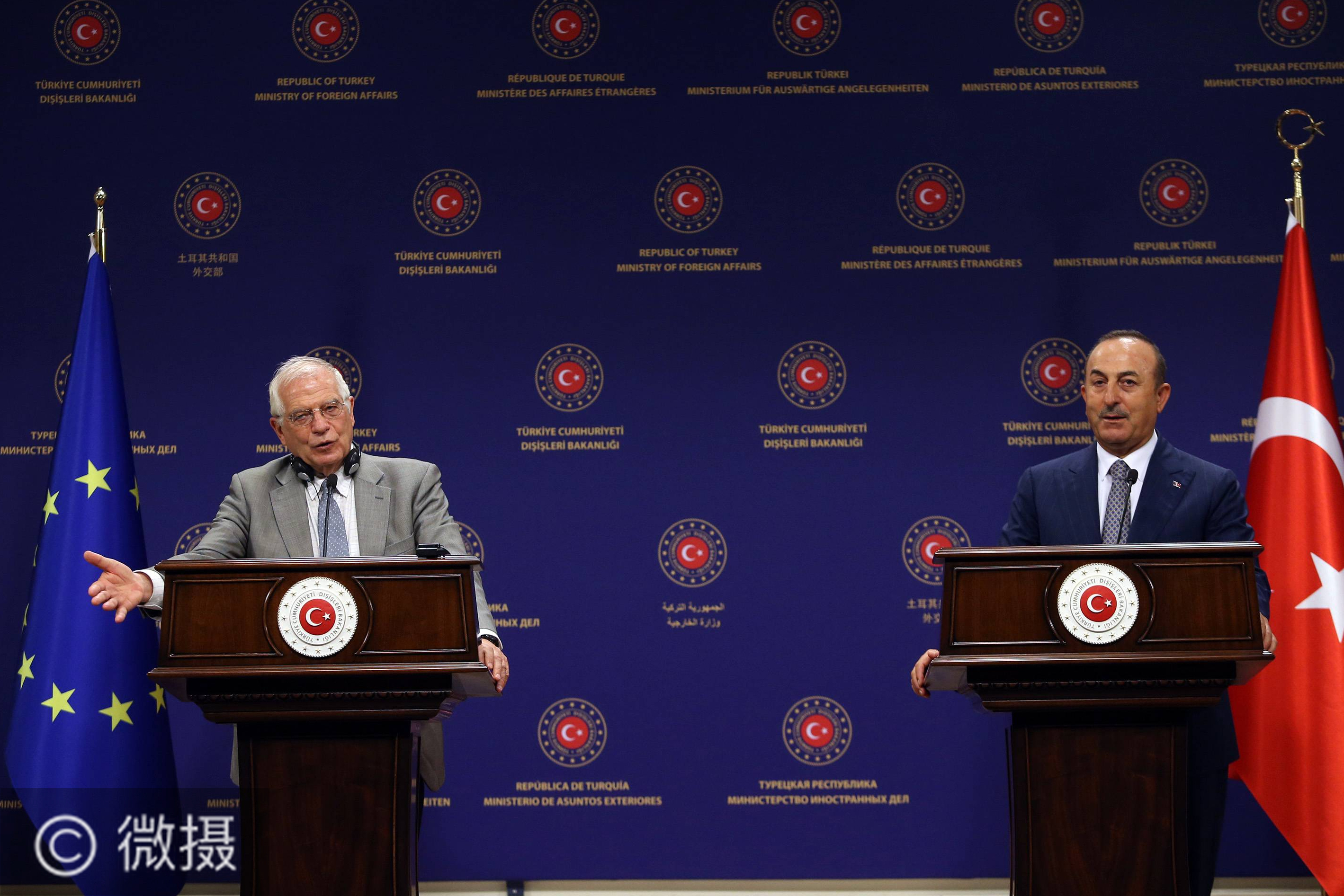 7月6日,在土耳其安卡拉,土耳其外交部长恰武什奥卢(右)与欧盟外交与安全政策高级代表博雷利出席联合记者会。土耳其外交部长恰武什奥卢6日表示,如果欧盟因东地中海地区分歧而决定对土耳其实施新制裁,土耳其将采取反制措施。新华社发