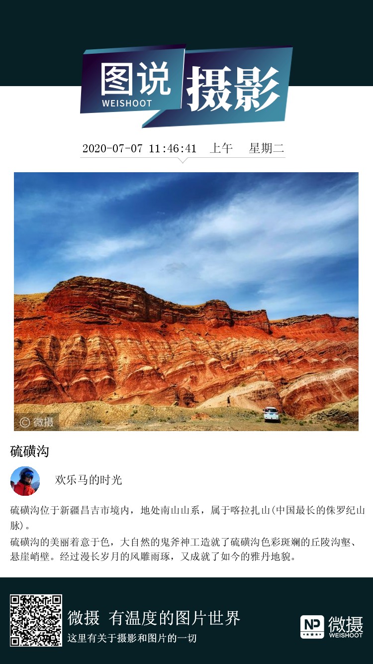 硫磺沟位于新疆昌吉市境内,地处南山山系,属于喀拉扎山(中国最长的侏罗纪山脉)。 硫磺沟的美丽着意于色,大自然的鬼斧神工造就了硫磺沟色彩斑斓的丘陵沟壑、悬崖峭壁。经过漫长岁月的风雕雨琢,又成就了如今的雅丹地貌。