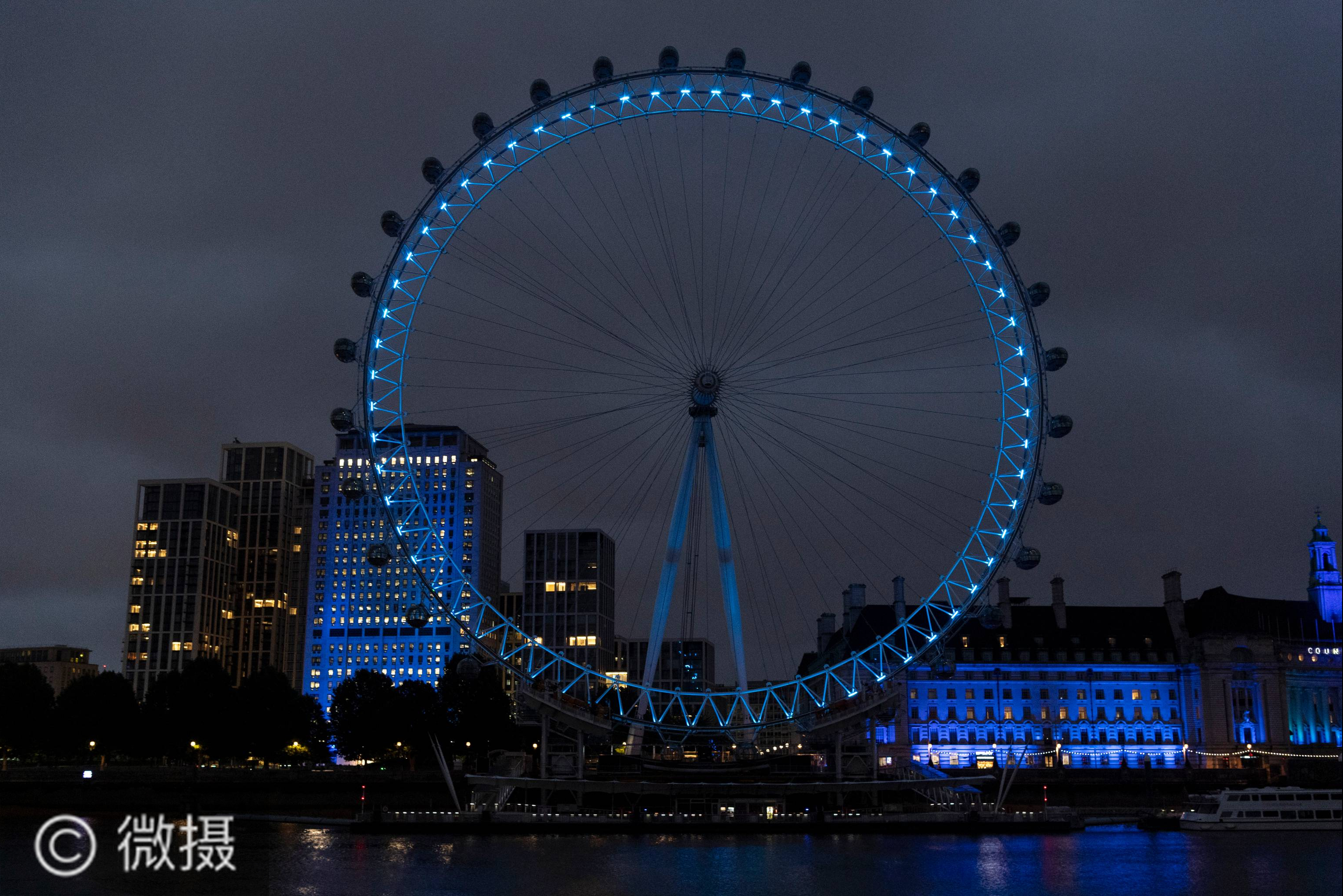 这是7月4日在英国伦敦拍摄的点亮蓝色灯光的“伦敦眼”。当晚,伦敦一些地标建筑亮起蓝色灯光,祝贺7月5日到来的英国国民保健制度(NHS)建立72周年纪念日,并表示对抗击新冠疫情的医护人员的敬意。 新华社发(雷伊·唐摄)