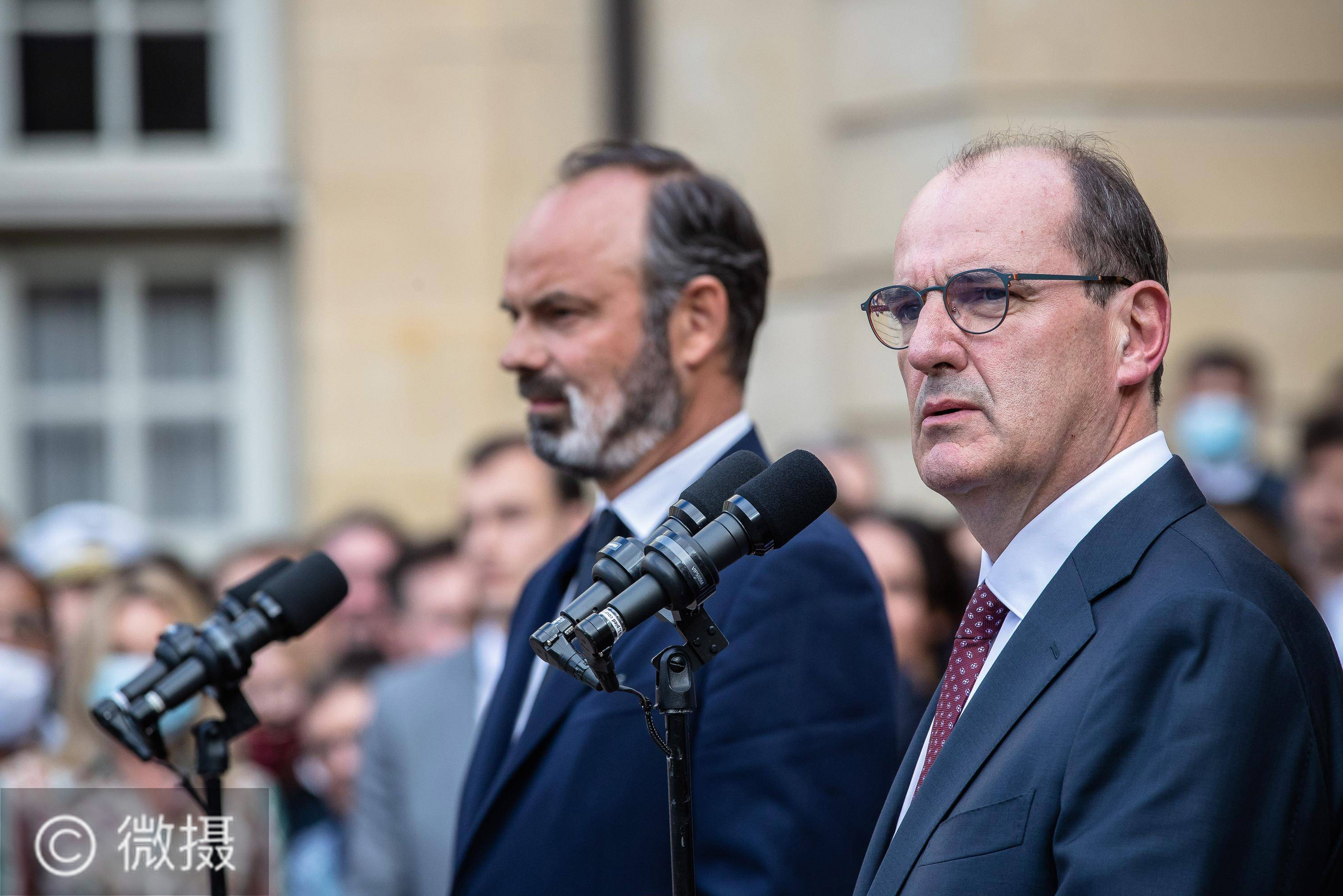 7月3日,在法国巴黎总理府,卸任总理爱德华·菲利普(左)与新任总理让·卡斯泰出席权力交接仪式。法国总统府爱丽舍宫3日发布公报说,总统马克龙任命让·卡斯泰为新总理,负责组建政府。 新华社发(奥雷利安·莫里萨尔摄)