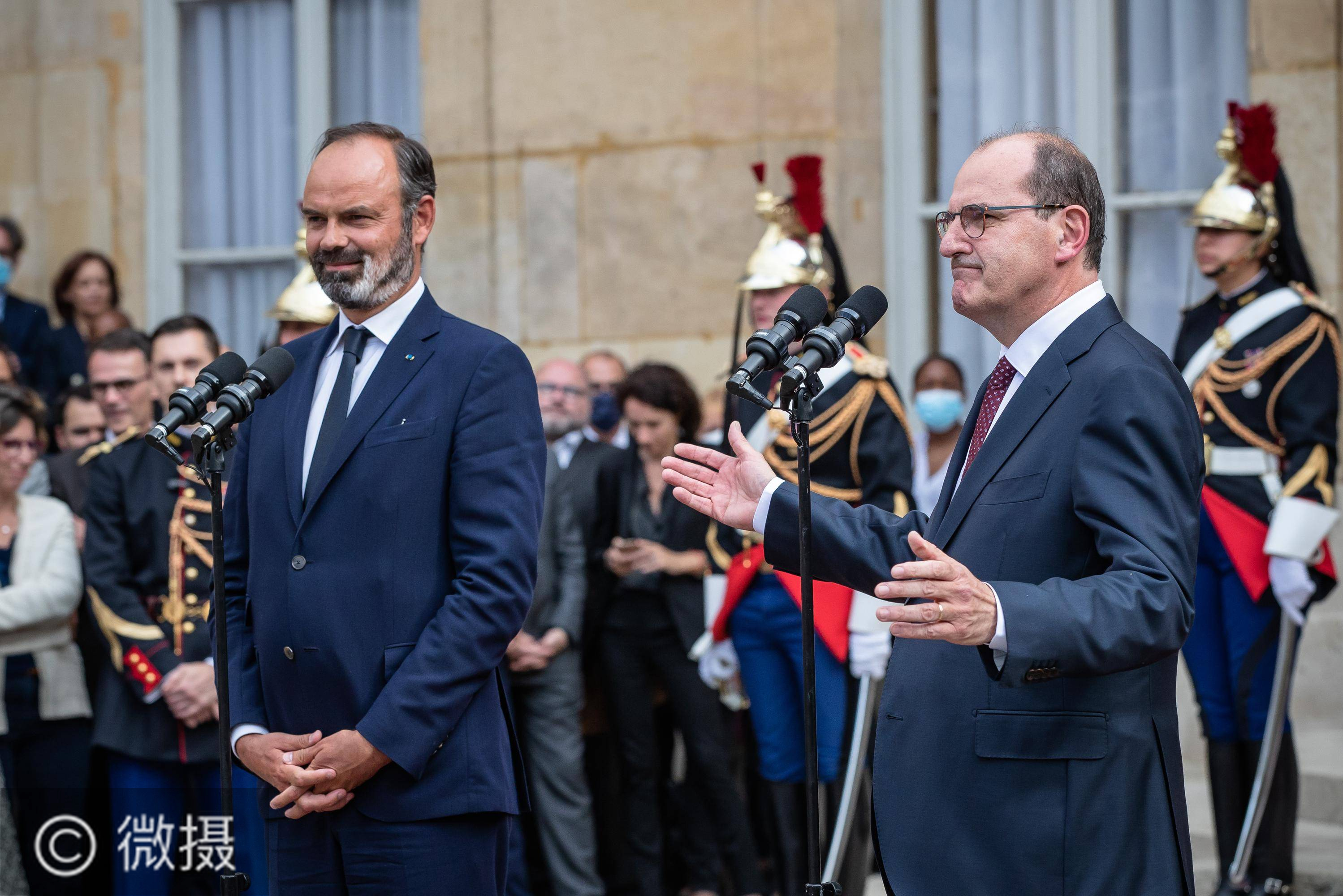 7月3日,在法国巴黎总理府,卸任总理爱德华·菲利普(前左)与新任总理让·卡斯泰(前右)出席权力交接仪式。法国总统府爱丽舍宫3日发布公报说,总统马克龙任命让·卡斯泰为新总理,负责组建政府。新华社发(奥雷利安·莫里萨尔摄)