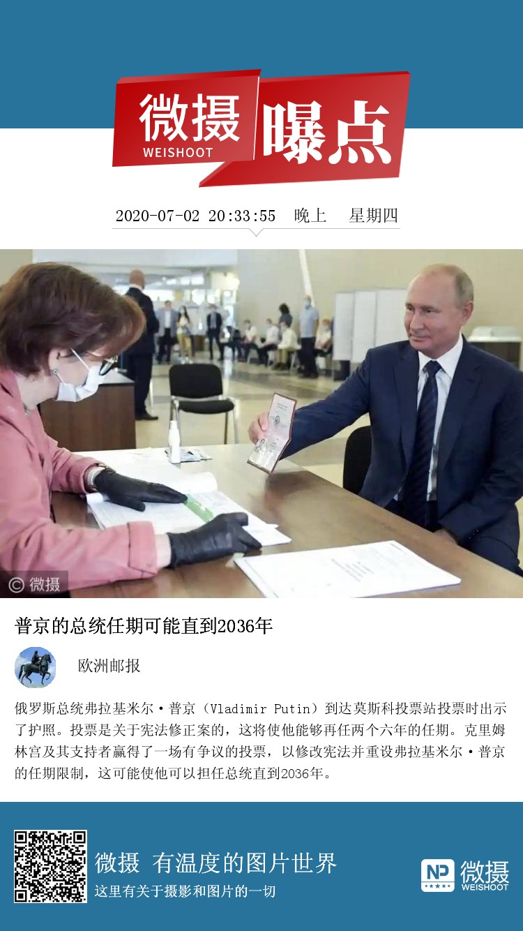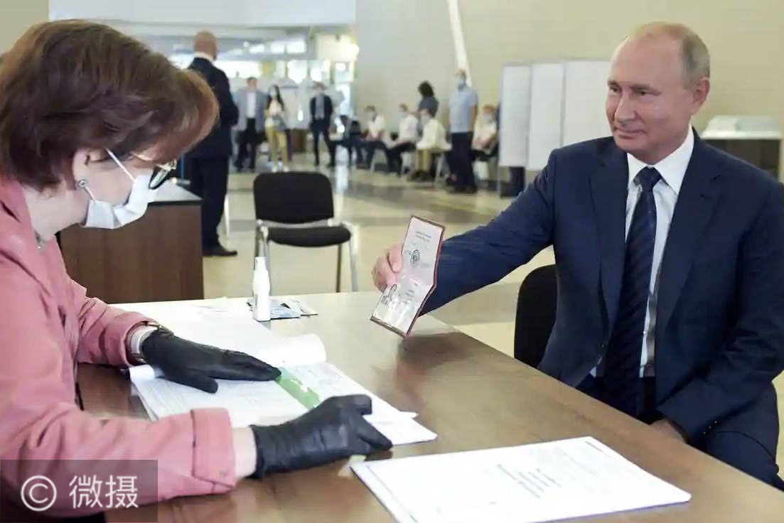 俄罗斯总统弗拉基米尔·普京(Vladimir Putin)到达莫斯科投票站投票时出示了护照。投票是关于宪法修正案的,这将使他能够再任两个六年的任期。克里姆林宫及其支持者赢得了一场有争议的投票,以修改宪法并重设弗拉基米尔·普京的任期限制,这可能使他可以担任总统直到2036年。