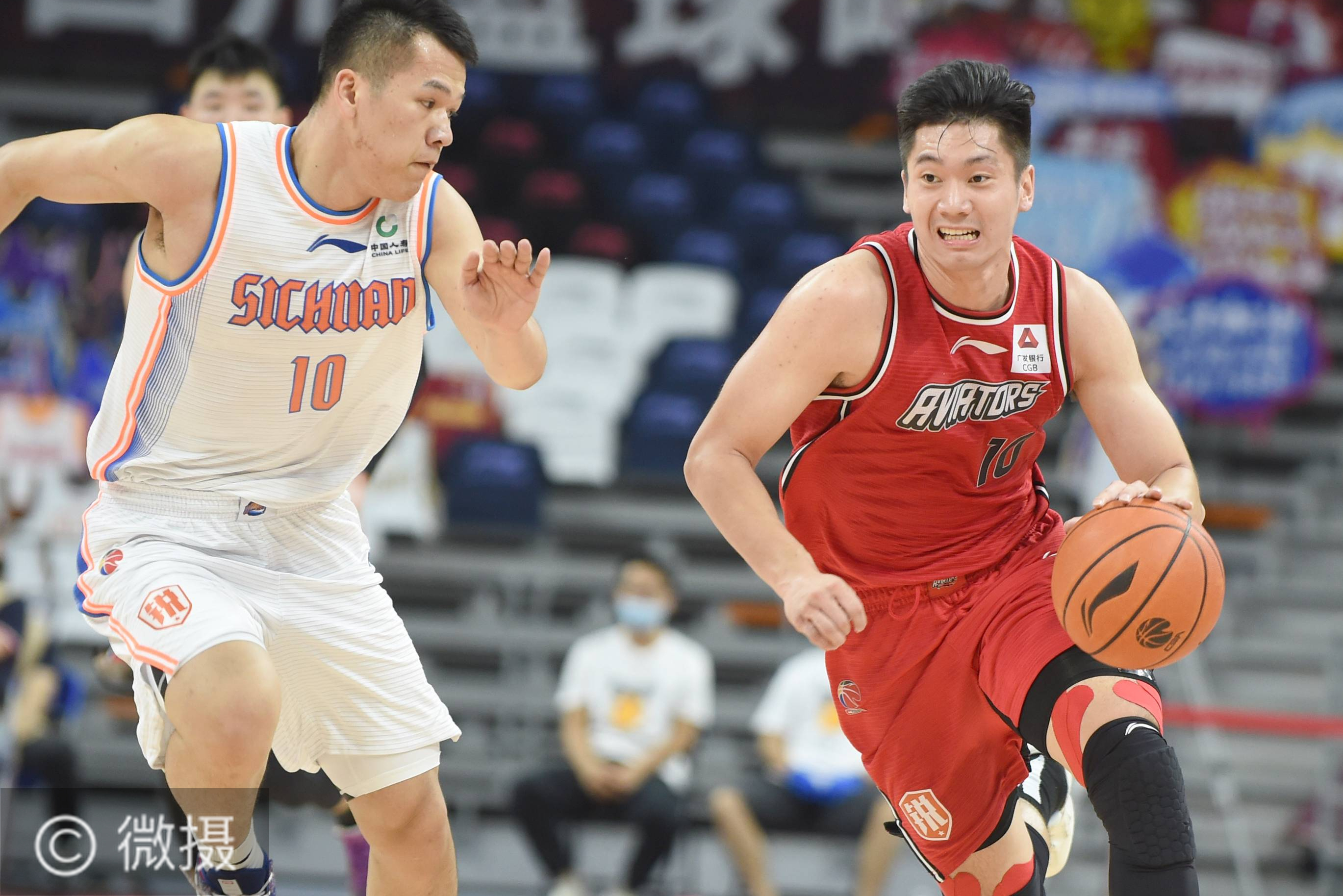 7月1日,深圳马可波罗队球员白昊天(右)在比赛中带球突破。当日,在广东东莞举行的2019-2020赛季中国男子篮球职业联赛(CBA)复赛第一阶段比赛中,深圳马可波罗队以92比76战胜四川五粮金樽队。新华社记者 卢汉欣 摄