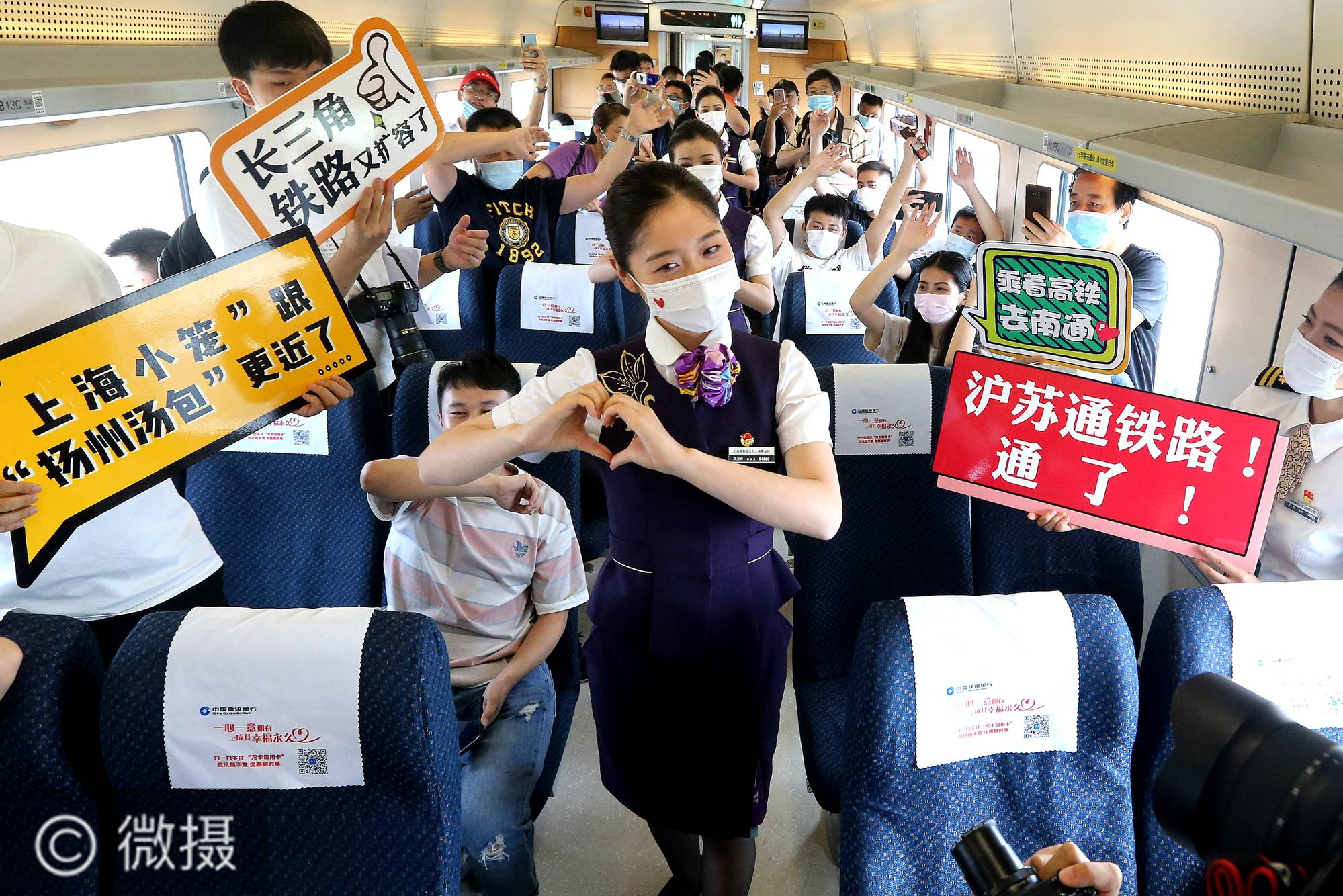 7月1日,C3836次列车乘务员在车厢内为旅客表演节目。当日,沪苏通铁路开通运营,上海至南通最快旅行时间压缩至1小时6分钟。沪苏通铁路是国家“八纵八横”高铁网沿海通道,也是京沪第二通道的重要组成部分,全长143公里,设计时速200公里。新华社记者 陈飞 摄
