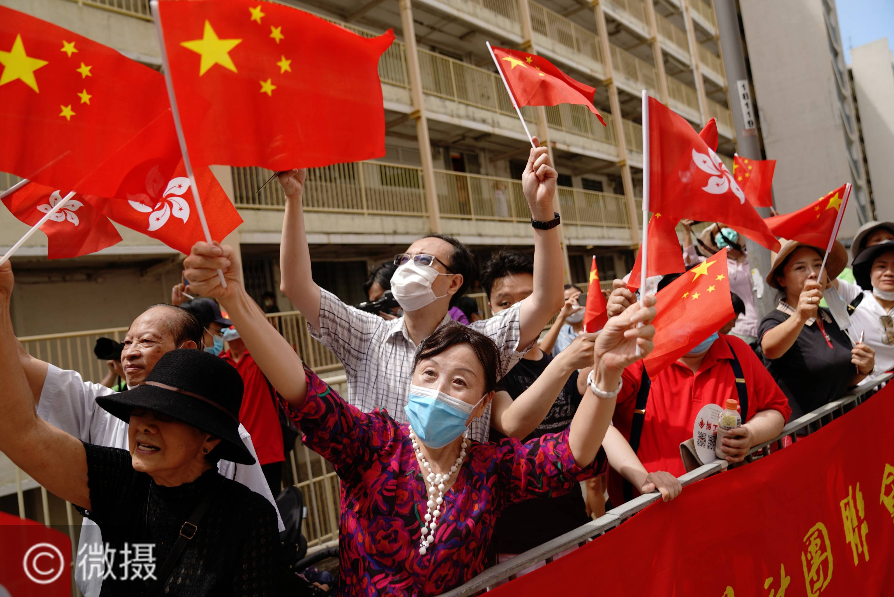 巴士巡游庆回归。 7月1日,市民挥舞国旗、区旗和巡游巴士互动。当日,悬挂着“庆香港回归贺国安立法”标语的巴士在香港、九龙和新界巡游,庆祝香港回归祖国23周年。新华社记者 王申 摄