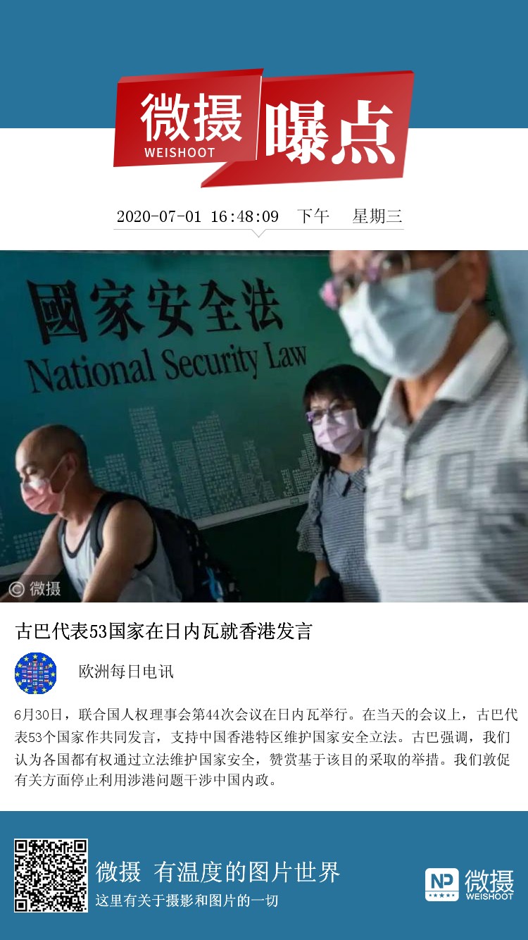 6月30日,联合国人权理事会第44次会议在日内瓦举行。在当天的会议上,古巴代表53个国家作共同发言,支持中国香港特区维护国家安全立法。古巴强调,我们认为各国都有权通过立法维护国家安全,赞赏基于该目的采取的举措。我们敦促有关方面停止利用涉港问题干涉中国内政。