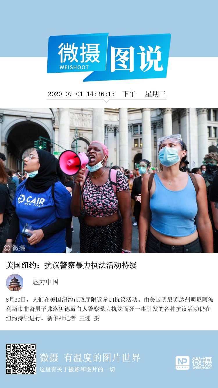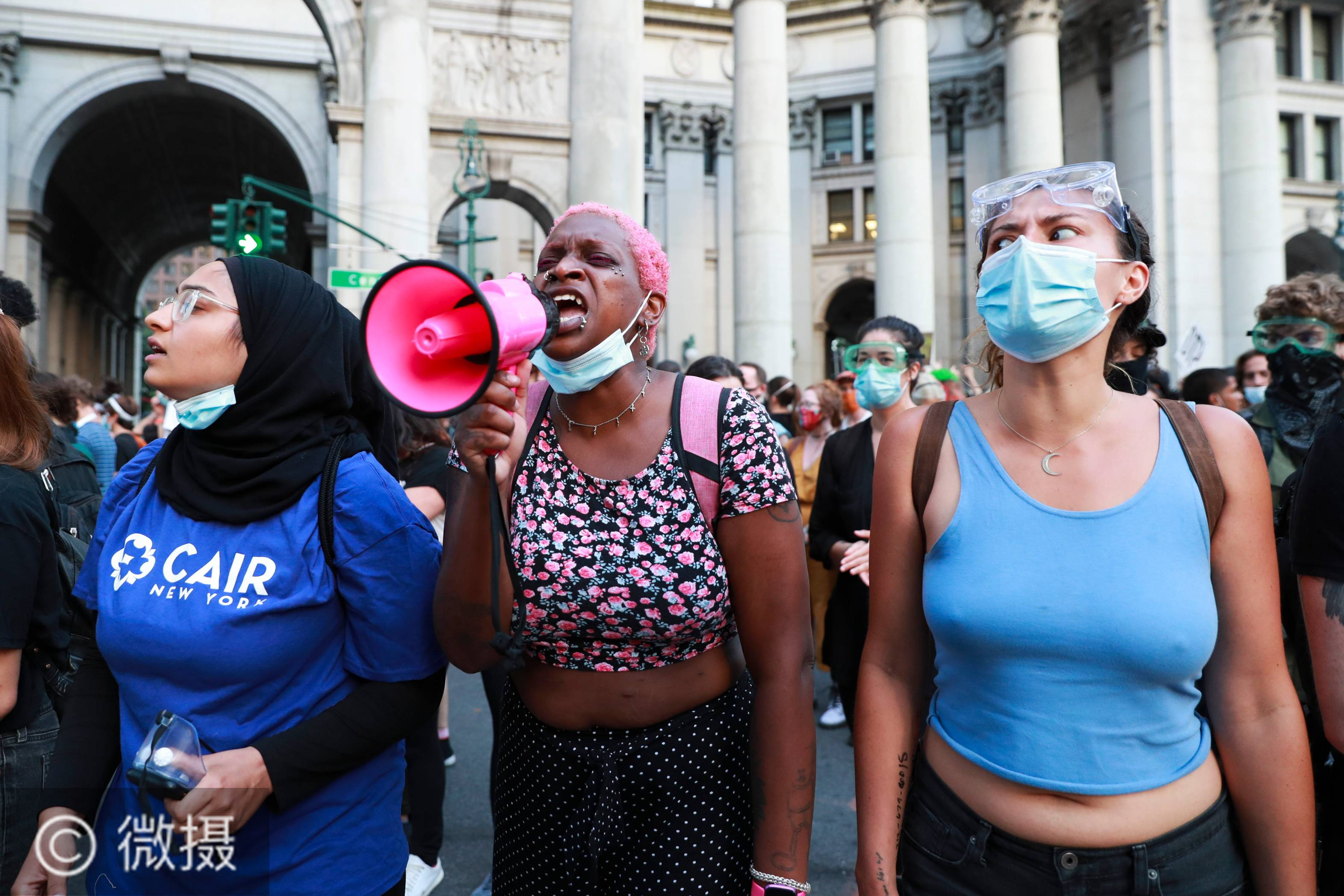 6月30日,人们在美国纽约市政厅附近参加抗议活动。由美国明尼苏达州明尼阿波利斯市非裔男子弗洛伊德遭白人警察暴力执法而死一事引发的各种抗议活动仍在纽约持续进行。新华社记者 王迎 摄