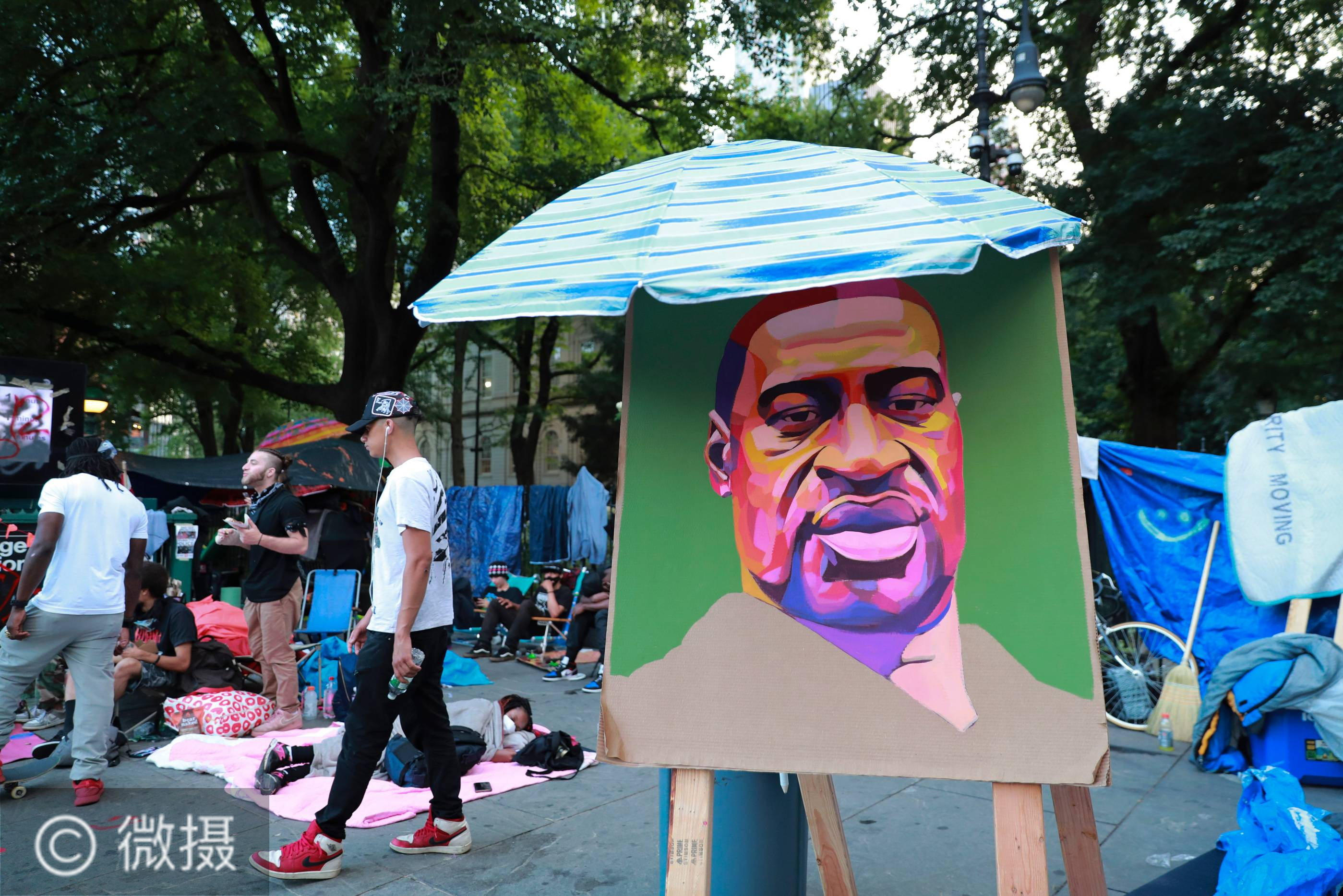 这是6月30日在美国纽约市政厅外“占领市政厅”抗议活动现场拍摄的弗洛伊德画像。由美国明尼苏达州明尼阿波利斯市非裔男子弗洛伊德遭白人警察暴力执法而死一事引发的各种抗议活动仍在纽约持续进行。新华社记者 王迎 摄