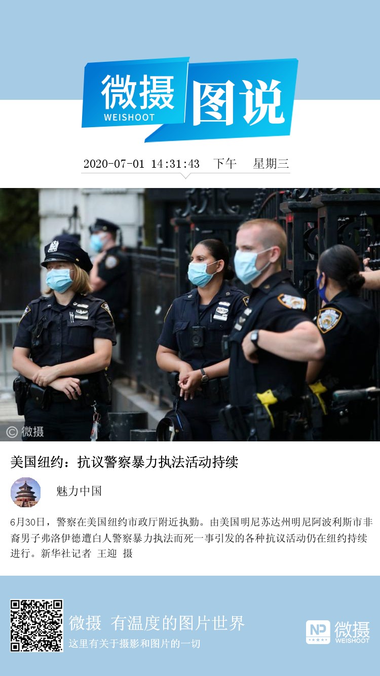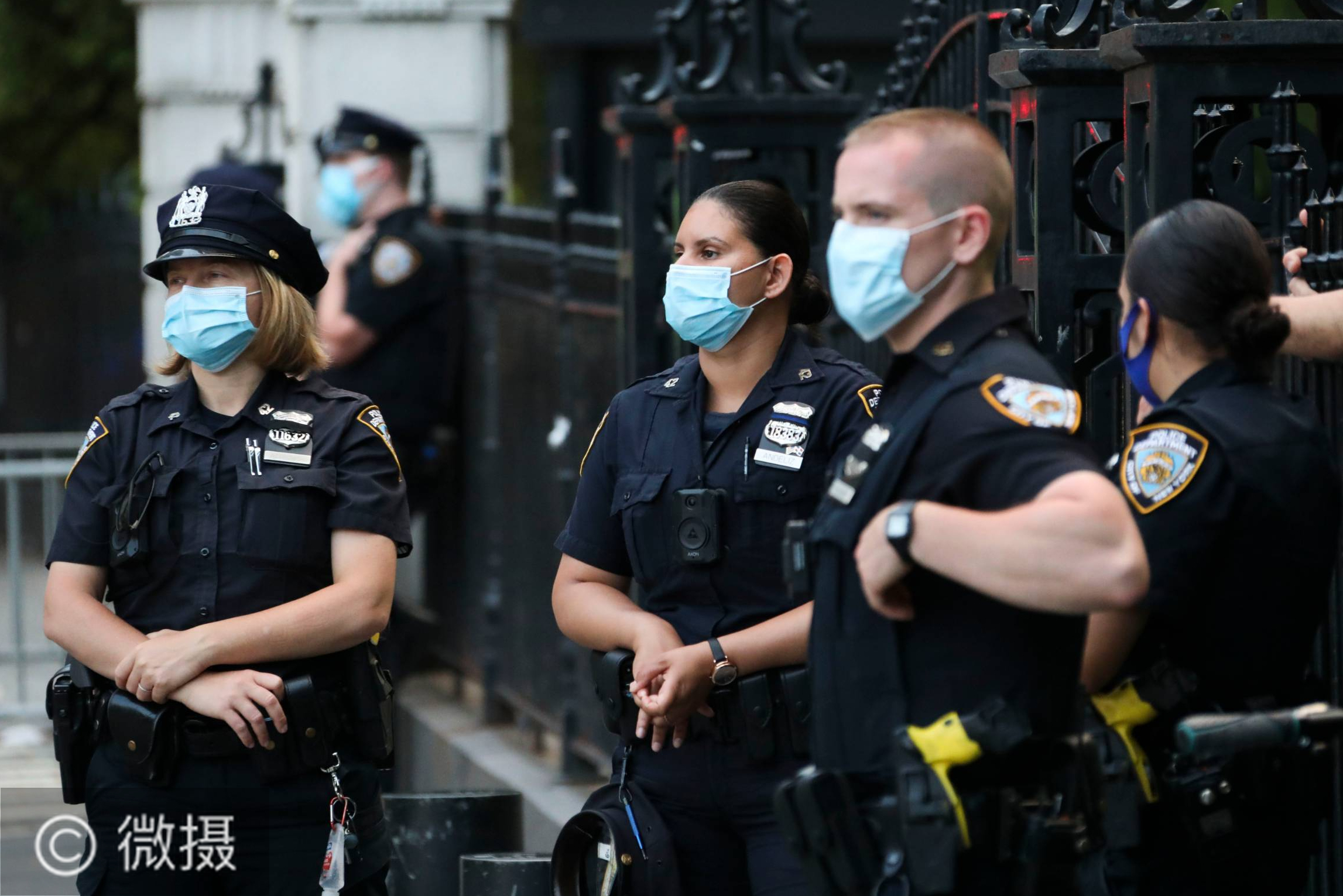 6月30日,警察在美国纽约市政厅附近执勤。由美国明尼苏达州明尼阿波利斯市非裔男子弗洛伊德遭白人警察暴力执法而死一事引发的各种抗议活动仍在纽约持续进行。新华社记者 王迎 摄
