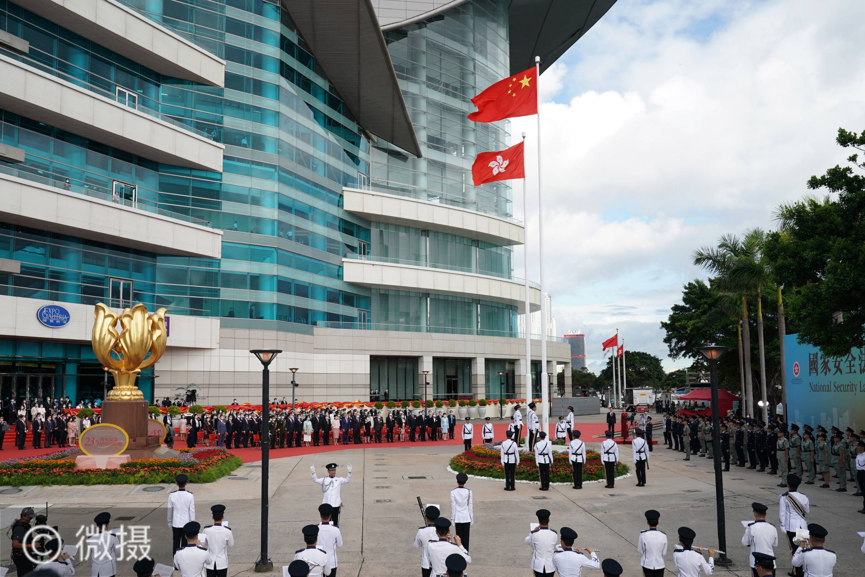 香港特区政府1日上午在湾仔金紫荆广场举行升旗仪式,庆祝香港回归祖国23周年。当日清晨,在香港警察银乐队的奏乐中,香港纪律部队升旗队及步操队迈着整齐的步伐进入金紫荆广场。8时左右,在庄严的国歌声中,鲜艳的中华人民共和国国旗和香港特区区旗冉冉升起。新华社记者 李钢 摄