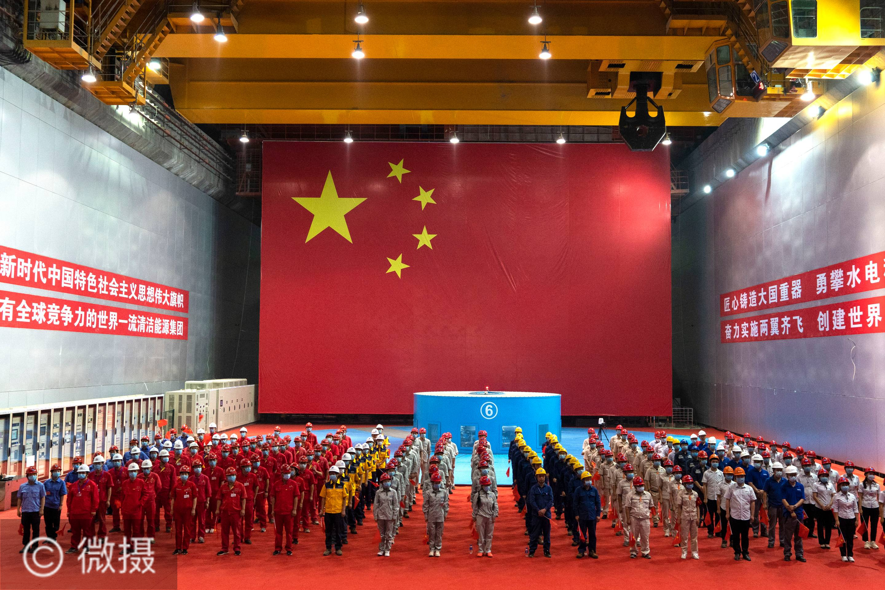 6月29日,在乌东德水电站左岸厂房,工程建设人员参加乌东德水电站首批机组投产发电仪式。当日,乌东德水电站首批机组投产发电仪式以视频方式举行。乌东德水电站位于昆明市禄劝县和四川省凉山州会东县交界,是实施“西电东送”的国家重大工程。将于2021年7月前建成投产。新华社记者 李梦馨 摄