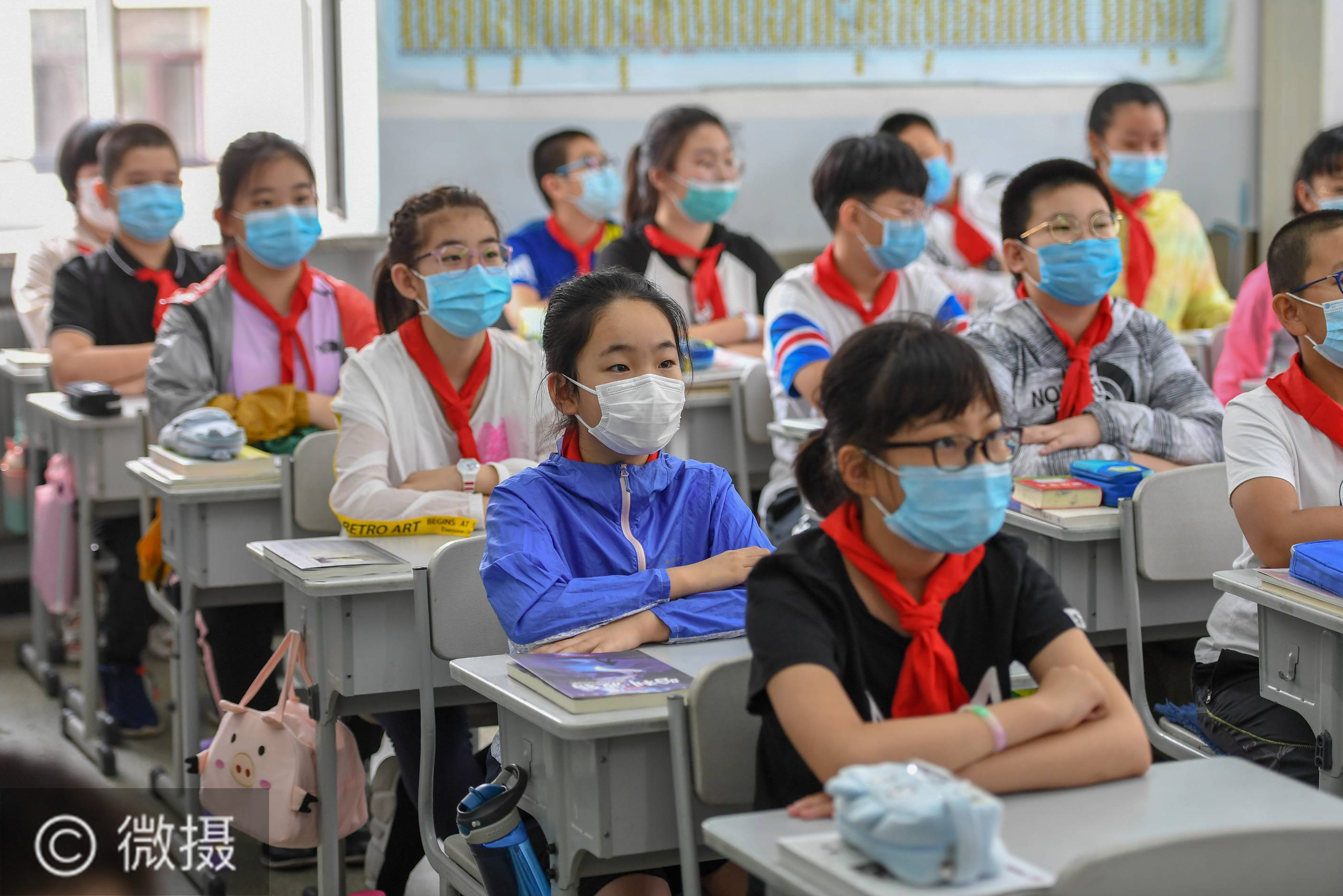 6月29日,在吉林市第一实验小学,五年级一班学生在听课。当日,吉林省吉林市城区初中一、二年级,小学四至六年级复课。吉林市教育局要求各学校组织学生错峰入校、放学、就餐和参加体育活动,确保校园疫情防控安全。新华社记者 张楠 摄